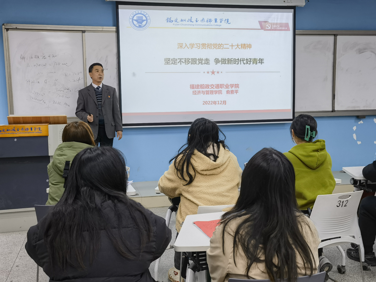 為深入學(xué)習(xí)宣傳貫徹黨的二十大精神,切實將思想認(rèn)識行動統(tǒng)一到黨的二十大精神上來,2022年12月14日下午,經(jīng)濟與管理學(xué)院黨總支書記俞素平于福船園求實樓207教室開展黨的二十大精神專題宣講會。經(jīng)濟與管理學(xué)院第二黨支部學(xué)生黨員參加了此次宣講會。