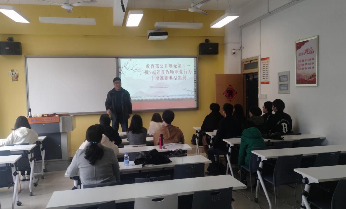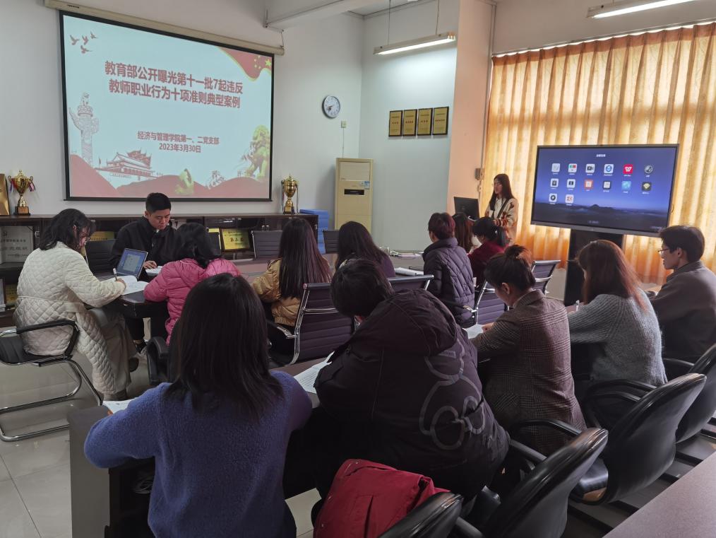為深入貫徹落實(shí)黨的二十大精神,進(jìn)一步加強(qiáng)教師師德師風(fēng)建設(shè),不斷提升教師思想政治素質(zhì)和職業(yè)道德水平,牢牢把握師德師風(fēng)作為評(píng)價(jià)教師隊(duì)伍素質(zhì)的第一標(biāo)準(zhǔn),積極弘揚(yáng)高尚師德,自覺規(guī)范職業(yè)行為,對(duì)師德失范行為“零容忍”。2023年3月22日至3月30日,經(jīng)濟(jì)與管理學(xué)院以支部(教研室)為單位,結(jié)合每周一次的師德師風(fēng)學(xué)習(xí),統(tǒng)一安排部署開展了以“教育部公開曝光第十一批7起違反教師職業(yè)行為十項(xiàng)準(zhǔn)則典型案例”為主題的師德學(xué)習(xí)活動(dòng),通過集中與個(gè)人自學(xué)相結(jié)合的學(xué)習(xí)方式,要求全體教師從典型案例中汲取教訓(xùn)、自查自省,自覺做到從嚴(yán)修身、從嚴(yán)律己,培養(yǎng)高尚道德情操,提升職業(yè)道德水準(zhǔn),營(yíng)造風(fēng)清氣正的育人環(huán)境。