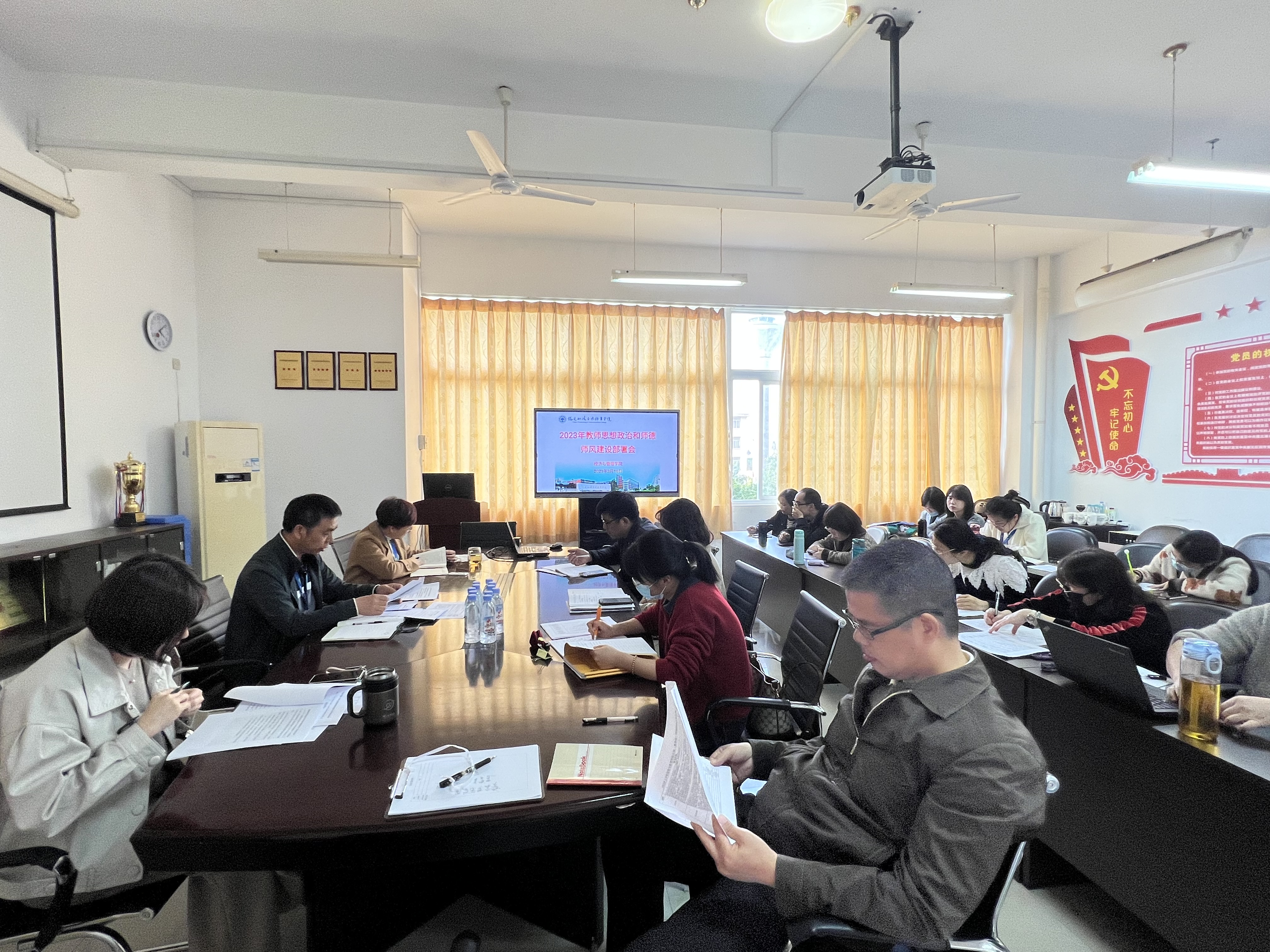 為深入學(xué)習(xí)貫徹習(xí)近平總書記關(guān)于教育的重要論述和和師德師風(fēng)工作的重要指示精神,貫徹落實黨的二十大報告中提出的“加強(qiáng)師德師風(fēng)建設(shè),培養(yǎng)高素質(zhì)教師隊伍,弘揚(yáng)尊師重教社會風(fēng)尚”的重要決策部署,持續(xù)加強(qiáng)和推進(jìn)教師思想政治素質(zhì)和師德師風(fēng)建設(shè),3月16日,經(jīng)濟(jì)與管理學(xué)院召開了2023年教師思想政治和師德師風(fēng)建設(shè)部署會。經(jīng)濟(jì)與管理學(xué)院副科級以上干部、各支部書記(副書記)、各教研室(實訓(xùn)中心)主任等參加了會議。會議由黨總支書記俞素平同志主持。