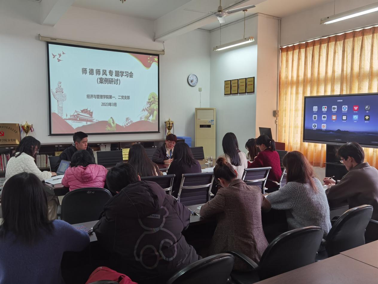 為全面貫徹落實黨的二十大報告中提出的“加強師德師風建設,培養(yǎng)高素質(zhì)教師隊伍,弘揚尊師重教社會風尚”精神,切實落實新時代高校教師“鑄魂育人”使命,增強教師愛崗敬業(yè)、為人師表、以德立教、以德立身的自覺性。2023年3月31日,經(jīng)濟與管理學院第一、第二黨支部在31號樓412室開展師德師風主題教育與專題研討會。