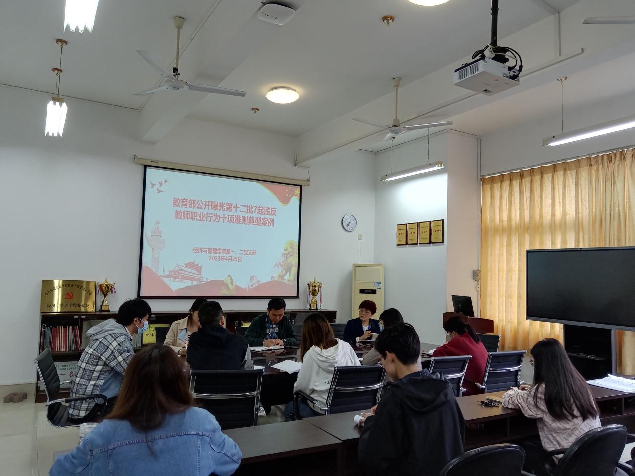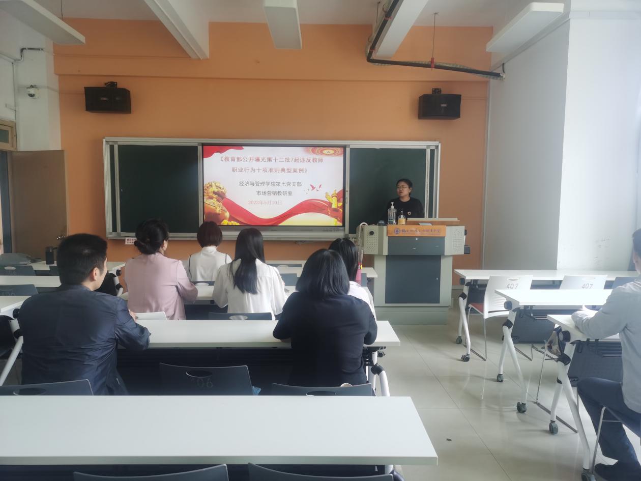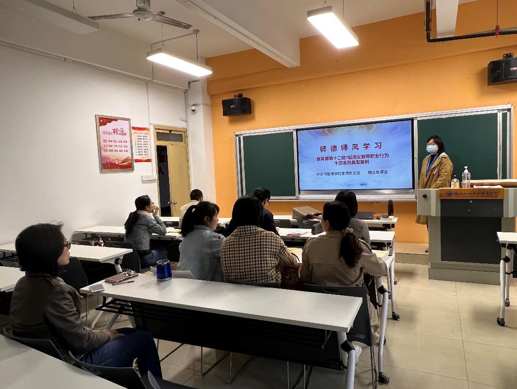 學高為師,身正為范。為進一步增強我院廣大教職工的紅線意識與底線思維,近期,經(jīng)濟與管理學院以支部(教研室)為單位,結(jié)合每周一次的師德師風學習,統(tǒng)一安排部署開展了以“教育部公開曝光第十二批7起違反教師職業(yè)行為十項準則典型案例”為主題的師德學習活動,通過集中與個人自學相結(jié)合的學習方式,要求全體教師嚴把師德師風第一標準,嚴守師德師風規(guī)范,嚴格要求自己,加強自身思想政治和師德師風建設,將師德師風作為評價教師隊伍素質(zhì)的第一標準,對師德違規(guī)問題進行“零容忍”處理。