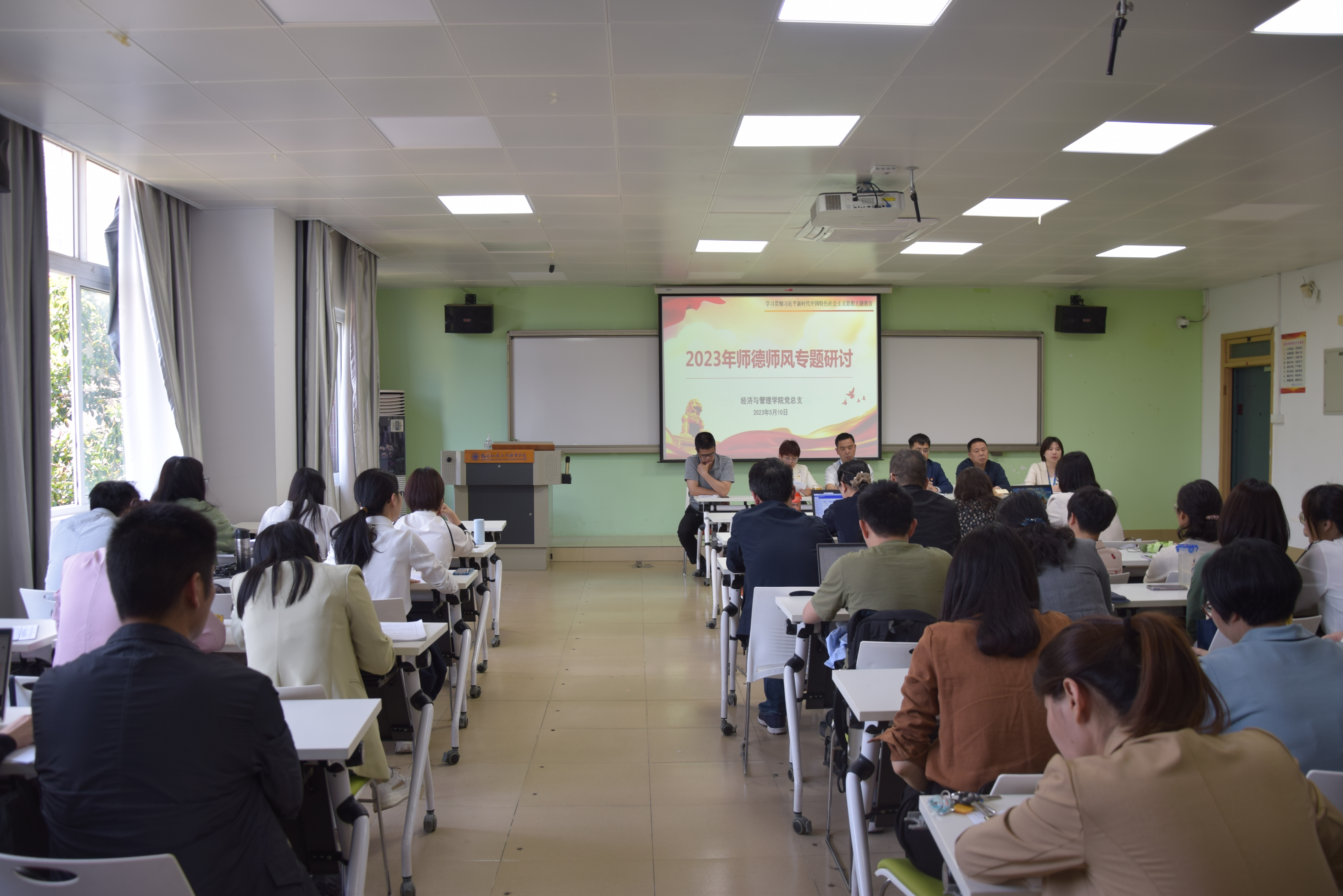 為深入貫徹落實(shí)黨的二十大精神,推進(jìn)學(xué)習(xí)貫徹習(xí)近平新時(shí)代中國(guó)特色社會(huì)主義思想主題教育走深走實(shí),進(jìn)一步加強(qiáng)教師師德師風(fēng)建設(shè),不斷提升教師思想政治素質(zhì)和職業(yè)道德水平,牢牢把握師德師風(fēng)作為評(píng)價(jià)教師隊(duì)伍素質(zhì)的第一標(biāo)準(zhǔn),積極弘揚(yáng)高尚師德,5月10日,經(jīng)濟(jì)與管理學(xué)院召開學(xué)習(xí)貫徹習(xí)近平新時(shí)代中國(guó)特色社會(huì)主義思想主題教育之師德師風(fēng)專題研討會(huì)師德師風(fēng)專題學(xué)習(xí)研討會(huì)。會(huì)議由院長(zhǎng)房曰榮主持,學(xué)院全體教職工參加了此次活動(dòng)。