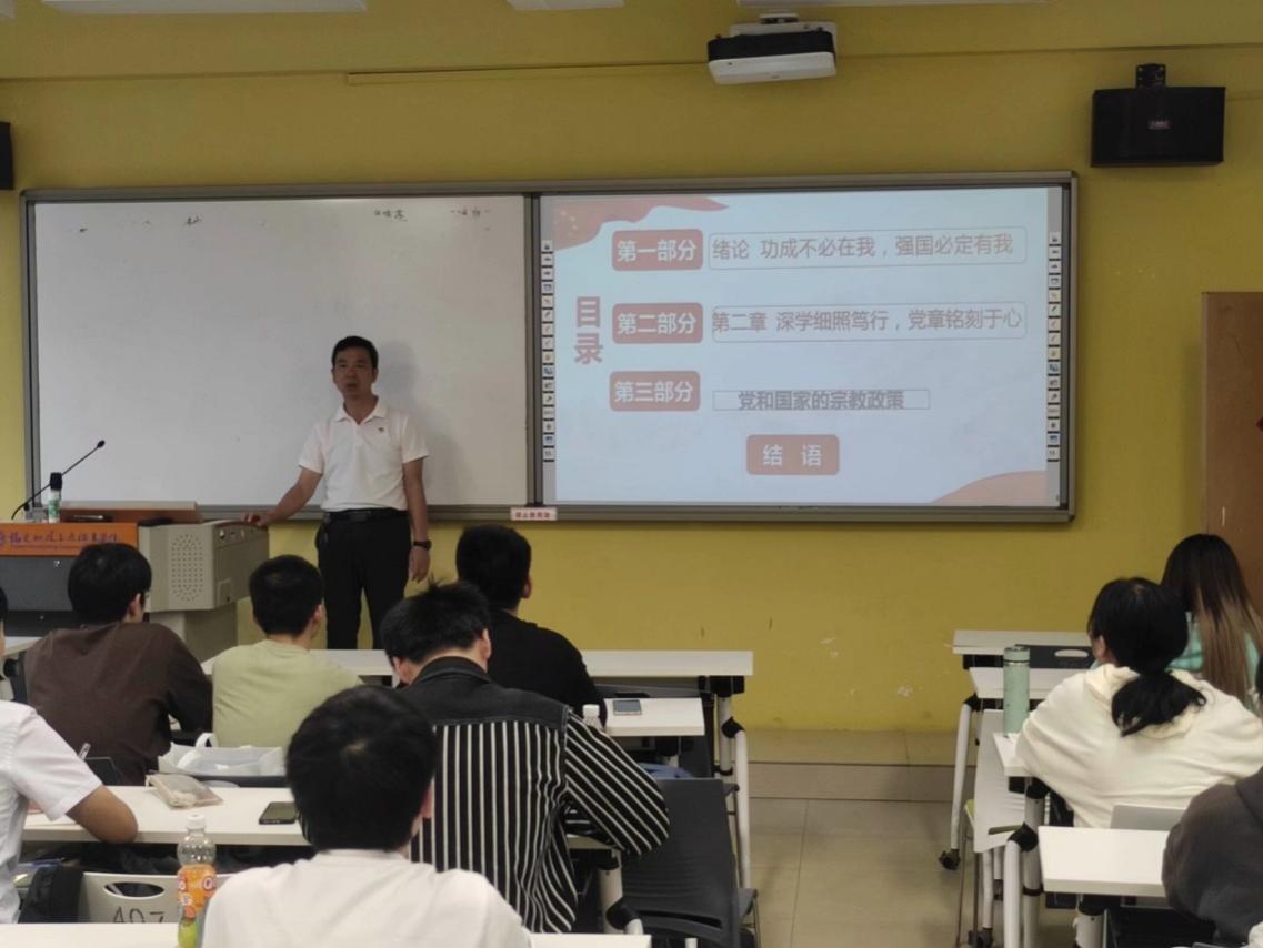 我院黨總支書記俞素平以“功成不必在我,強國必定有我”為切入點,強調(diào)黨章是規(guī)范和指導全黨行為的總章程,同學們要認真學習并踐行新黨章,要時時以黨章為遵循,深學細研其中所蘊含的立場觀點,多照一照自我,多量一量自身。最后,俞書記希望同學們要時刻保持清醒的頭腦,加強思想武裝,正確認識宗教,崇尚科學,為實現(xiàn)中華民族偉大復興的中國夢貢獻力量。