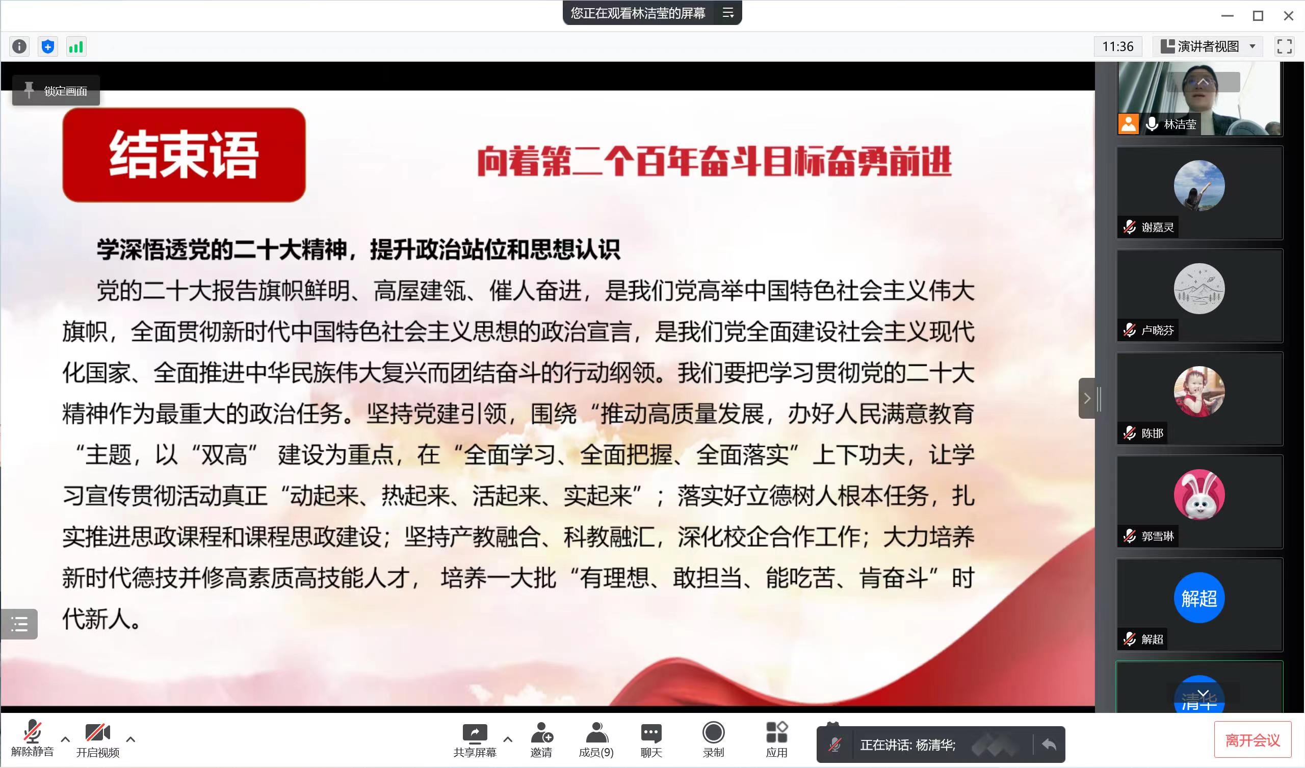 此次專題宣講,圍繞黨的二十大鮮明主題、重大意義、報告的15個方面內(nèi)容進(jìn)行解讀,聚焦新論述新論斷,重點(diǎn)對黨的二十大報告的“關(guān)鍵詞”進(jìn)行了詳細(xì)闡釋。講授過程緊密結(jié)合國內(nèi)外形勢,穿插個人深入思考和現(xiàn)實(shí)案例,深入淺出,主旨鮮明地揭示了報告精髓和要義。黨課最后,林潔瑩同志強(qiáng)調(diào),全體師生要把學(xué)習(xí)貫徹黨的二十大精神作為當(dāng)前和今后一個時期的首要政治任務(wù),在全面學(xué)習(xí)、全面把握、全面落實(shí)上下功夫,學(xué)深悟透,準(zhǔn)確學(xué)習(xí)把握黨的二十大精神核心要義和豐富內(nèi)涵,把學(xué)習(xí)貫徹黨的二十大精神和學(xué)院重點(diǎn)工作結(jié)合起來,以黨的二十大精神為引領(lǐng),立足本職工作,堅(jiān)守培養(yǎng)社會主義建設(shè)者和接班人的育人本色,在新時代新征程上為學(xué)院轉(zhuǎn)型發(fā)展作出新的貢獻(xiàn)!