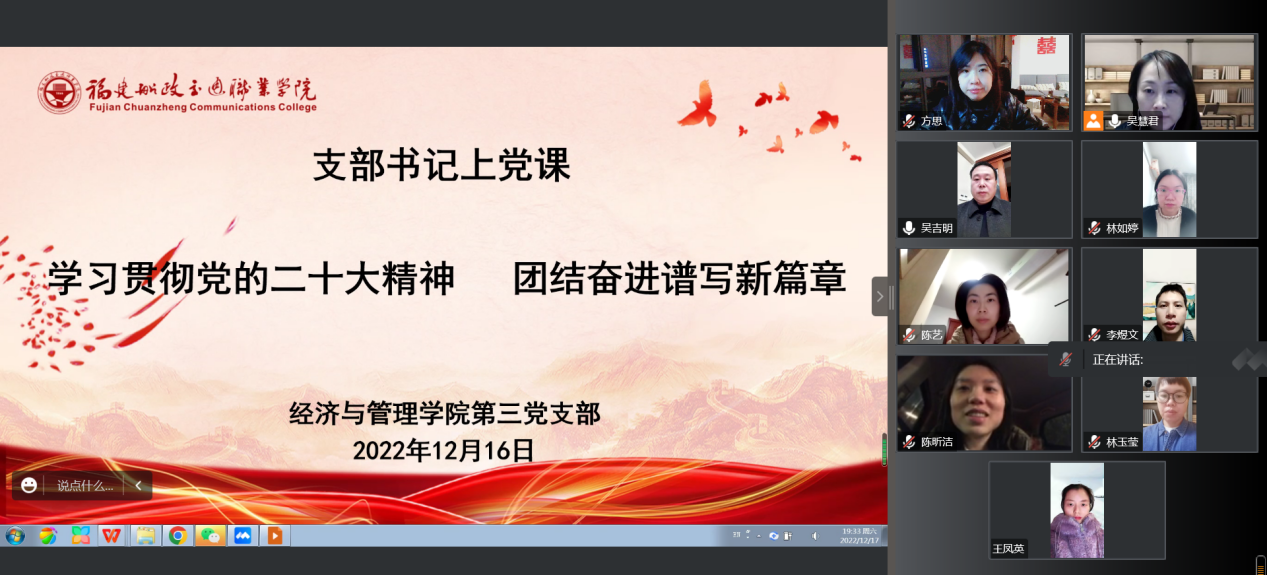 為增強學習宣傳貫徹黨的二十大精神的政治自覺、思想自覺、行動自覺,切實推動學習成果轉(zhuǎn)化為推進學院各項工作高質(zhì)量發(fā)展的實際成效,2022年12月16日,經(jīng)濟與管理學院第三黨支部書記吳吉明以《學習貫徹黨的二十大精神,團結(jié)奮進譜寫新篇章》為題開展黨的二十大精神專題宣講,第三黨支部全體黨員參加了此次宣講。