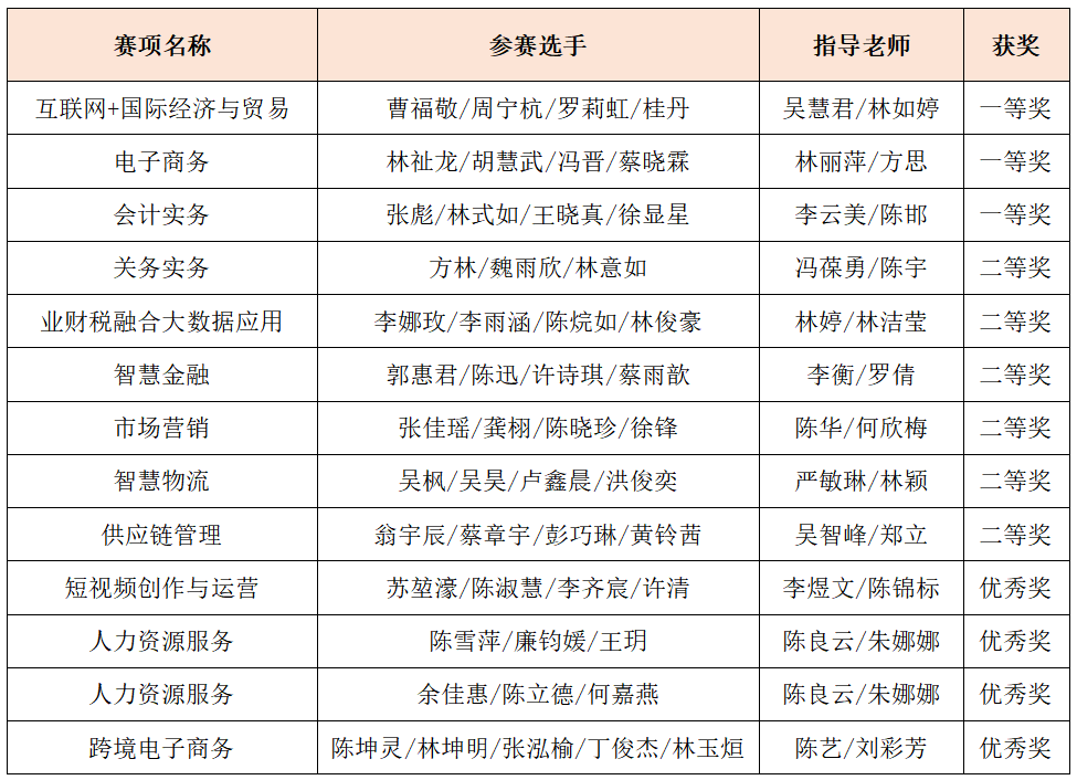 2024年福建職業(yè)院校技能大賽高職組賽事落下帷幕,我院參加了會計實務、智慧物流等12個賽項,在參賽團隊的奮勇拼搏下,經(jīng)過激烈角逐,最終獲得一等獎3項、二等獎6項、優(yōu)秀獎4項的佳績,其中會計實務、關(guān)務實務、互聯(lián)網(wǎng)+國際經(jīng)濟與貿(mào)易和電子商務等4個賽項順利晉級2024年全國職業(yè)院校技能大賽。