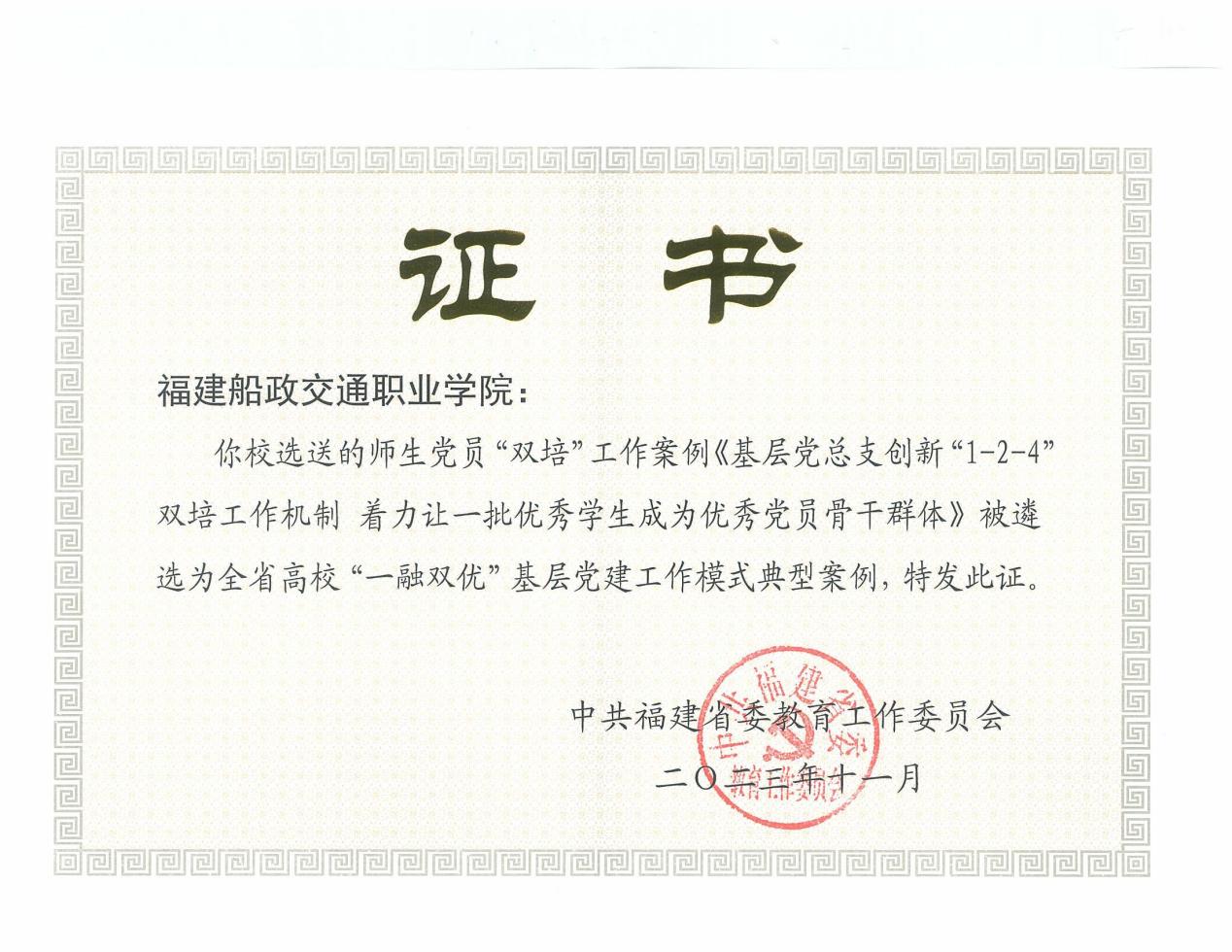 近日,省委教育工委公布全省高校“一融雙優(yōu)”基層黨建工作模式典型案例入選名單。我院工作案例《基層黨總支創(chuàng)新“1-2-4”雙培工作機制 著力讓一批優(yōu)秀學生成為優(yōu)秀黨員骨干群體》入選高職高專組師生黨員“雙培”工作案例。
