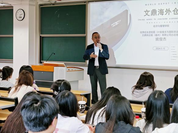 為全面落實立德樹人根本任務,大力培養(yǎng)高素質技能人才,助力發(fā)展新質生產力,發(fā)揮典型、示范帶動作用,凝聚各方力量,營造關心支持職業(yè)教育的良好氛圍,經濟與管理學院開展“一技在手,一生無憂”為主題的職教周活動。2024年5月15日,關務與外貿服務專業(yè)邀請了01級報關與國際貨運專業(yè)的校友——文鼎供應鏈(福州)有限公司總經理姚俊杰為22級關務與外貿服務專業(yè)的全體同學作“文鼎海外倉——跨境電商出口一站式解決方案”的講座。