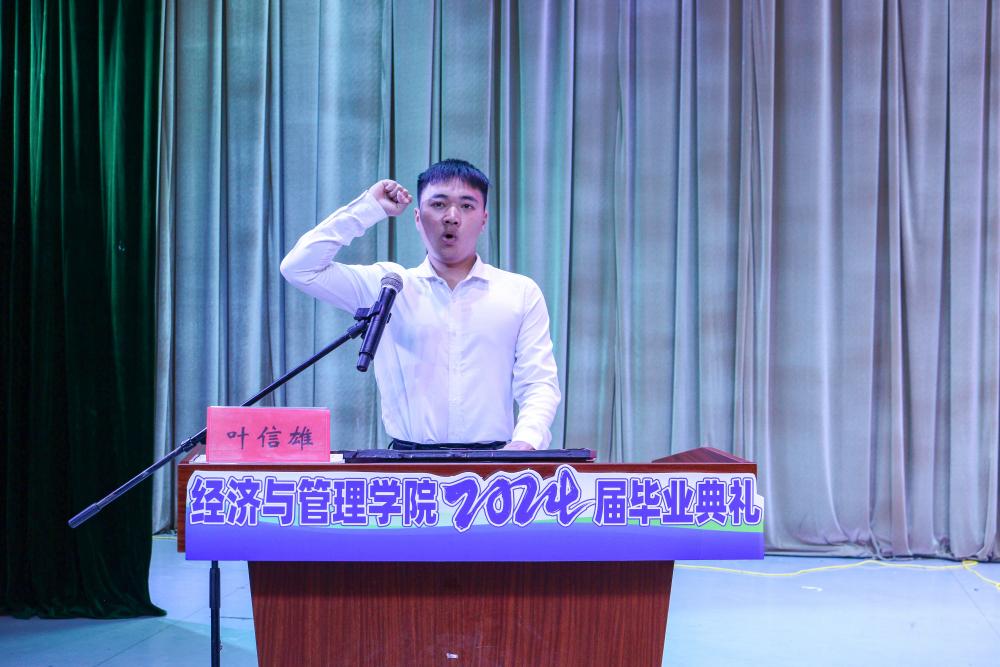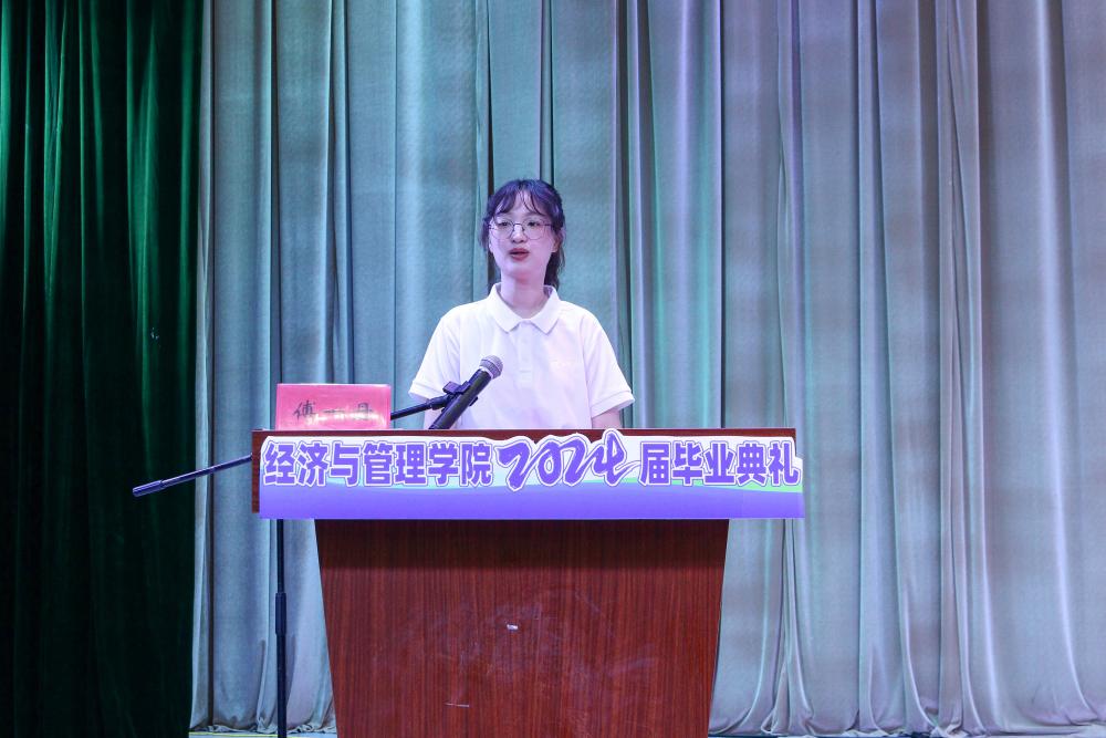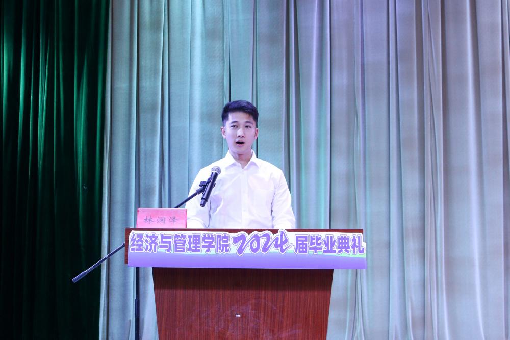 畢業(yè)生代表林潤澤感懷了在經(jīng)管學(xué)院三年的學(xué)習(xí)和生活經(jīng)歷,從相聚于此到如今奔赴五湖四海,他表達(dá)了同學(xué)間惺惺相惜的不舍,對(duì)老師們諄諄教誨的感激以及對(duì)學(xué)院的深深眷戀之情;同時(shí),他分享了自身的學(xué)習(xí)經(jīng)歷以及對(duì)未來的展望,表示將在未來的道路上,不斷追求卓越,提升自我價(jià)值,并鼓勵(lì)同學(xué)們要積極面對(duì)未來的挑戰(zhàn),不斷提升自己的能力,堅(jiān)定信念,勇往直前,用智慧和勇氣書寫新的時(shí)代篇章。