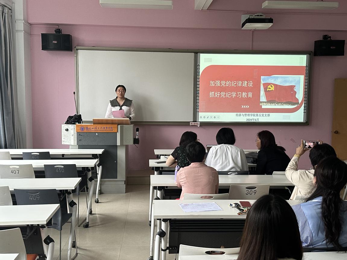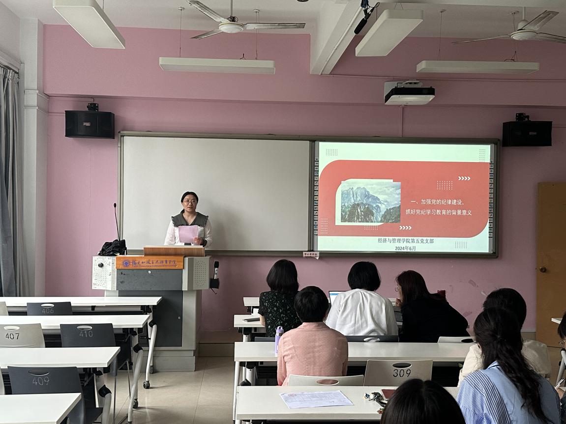 為深入開(kāi)展黨紀(jì)學(xué)習(xí)教育,引導(dǎo)黨員教師學(xué)紀(jì)、知紀(jì)、明紀(jì)、守紀(jì),進(jìn)一步推動(dòng)黨紀(jì)學(xué)習(xí)教育走深走實(shí),2024年6月5日,經(jīng)濟(jì)與管理學(xué)院第五黨支部舉辦“加強(qiáng)黨的紀(jì)律建設(shè)、抓好黨紀(jì)學(xué)習(xí)教育”專(zhuān)題黨課。本次黨課由支部書(shū)記林潔瑩授課,支部全體黨員參加了此次黨課。
