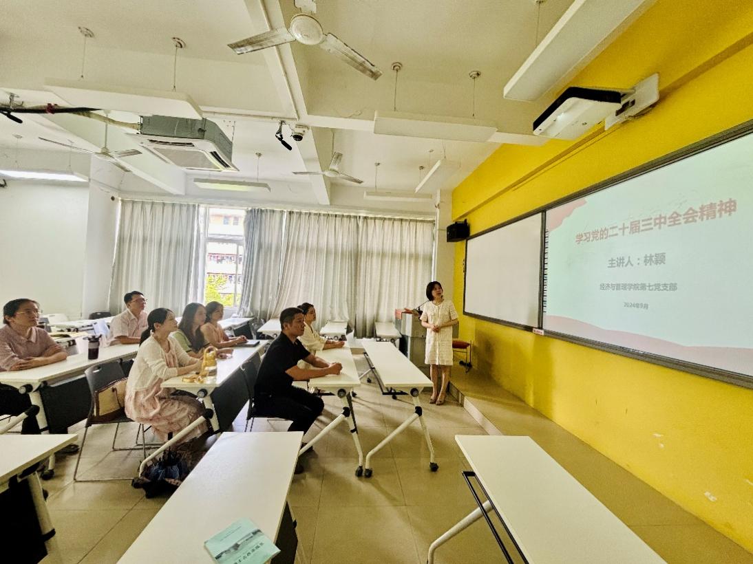 為深入學(xué)習(xí)貫徹黨的二十屆三中全會精神,進(jìn)一步提升黨員教師隊(duì)伍的政治素養(yǎng),引導(dǎo)黨員教師提高政治站位、強(qiáng)化擔(dān)當(dāng)意識、提升工作實(shí)績,9月25日,經(jīng)濟(jì)與管理學(xué)院第七黨支部在求實(shí)樓409教室開展黨的二十屆三中全會精神宣講活動。