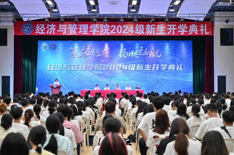 年華正茂啟新篇,矢志前行筑夢(mèng)圓。2024年9月25日,經(jīng)濟(jì)與管理學(xué)院2024級(jí)新生開(kāi)學(xué)典禮在文體中心隆重舉行。經(jīng)濟(jì)與管理學(xué)院黨總支書(shū)記俞素平,院長(zhǎng)房曰榮,廈門(mén)市海滄區(qū)職業(yè)中專(zhuān)學(xué)校副校長(zhǎng)謝文輝,經(jīng)濟(jì)與管理學(xué)院黨總支副書(shū)記林麗萍,副院長(zhǎng)吳吉明、林穎,團(tuán)委書(shū)記傅一丹等領(lǐng)導(dǎo)出席典禮,經(jīng)濟(jì)與管理學(xué)院各教研室主任,廈門(mén)市海滄區(qū)職業(yè)中專(zhuān)學(xué)校教師,2024級(jí)新生輔導(dǎo)員、班主任及全體新生、助導(dǎo)到場(chǎng)參加。典禮由副院長(zhǎng)林穎主持。