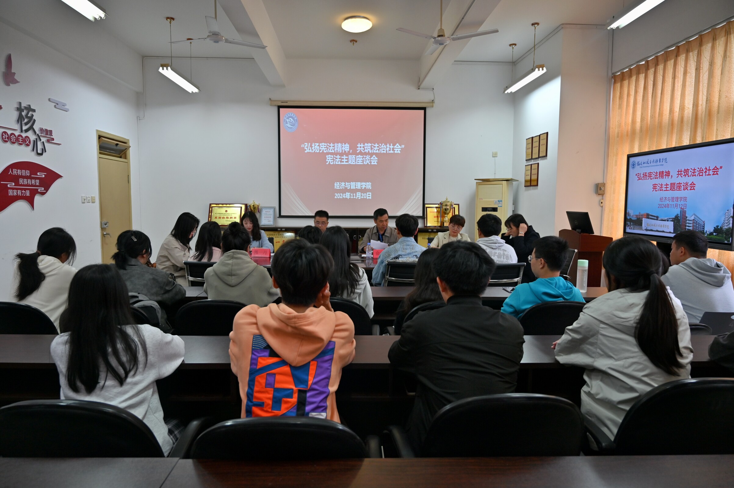 為深入貫徹習(xí)近平法治思想,經(jīng)濟(jì)與管理學(xué)院于2024年11月20日成功舉辦了“弘揚(yáng)憲法精神,共筑法治社會(huì)”憲法主題座談會(huì)。黨總支書記俞素平、院長(zhǎng)房曰榮、黨總支副書記林麗萍、團(tuán)委書記傅一丹及江瀟、王春英老師出席了本次活動(dòng)。