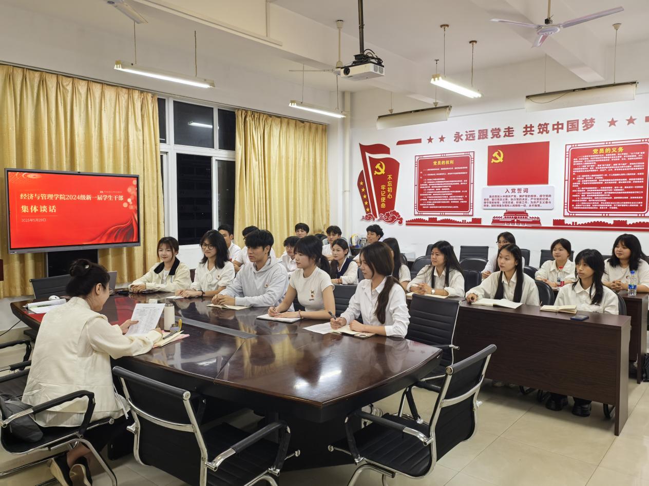 5月29日,經濟與管理學院召開2024級新一屆學生干部集體談話會。學院黨總支書記陳慧、學院團委書記傅一丹及全體新任學生干部參加了會議。