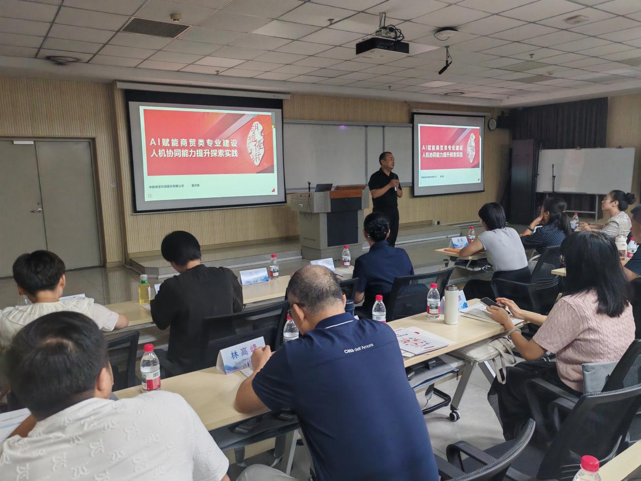 隨后的研討會上,中教暢享科技股份有限公司副總經(jīng)理潘洪鋒先生作了題為《AI賦能商貿(mào)類專業(yè)建設(shè)—人機協(xié)同能力提升探索與實踐》的主旨報告。潘總從產(chǎn)業(yè)視角出發(fā),深入分析了人工智能在商貿(mào)領(lǐng)域的應(yīng)用趨勢及其對崗位能力要求帶來的變化,系統(tǒng)闡述了如何利用AI技術(shù)賦能專業(yè)內(nèi)涵建設(shè)、課程體系重構(gòu)、教學資源開發(fā)以及學生人機協(xié)作能力培養(yǎng),并分享了企業(yè)在相關(guān)領(lǐng)域的探索經(jīng)驗與成功實踐,為院校推進教學改革提供了寶貴的思路借鑒。