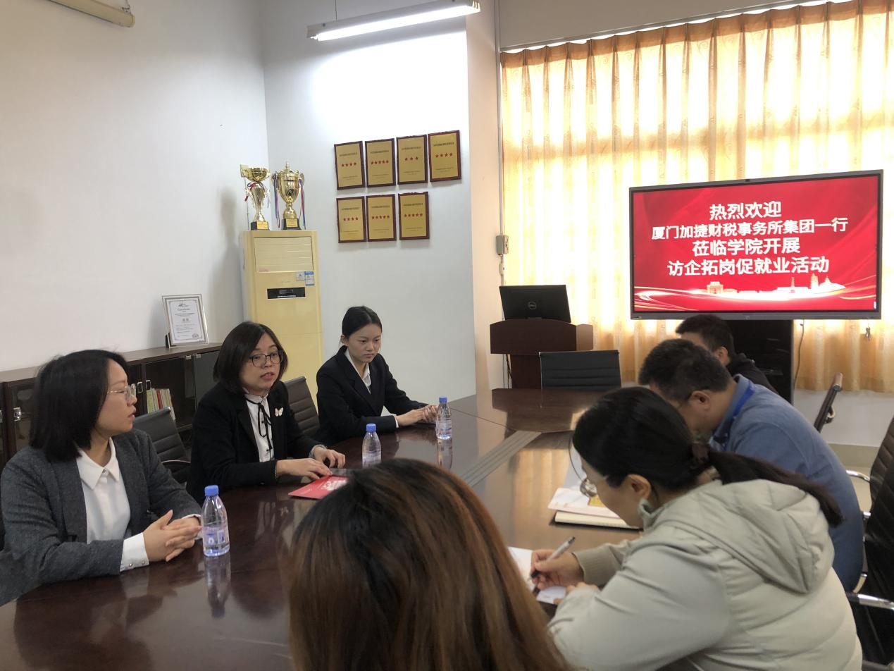 2025年11月20日下午,加捷集團副總經(jīng)理李霞應(yīng)邀來訪我院,與經(jīng)濟與管理學(xué)院開展訪企拓崗促就業(yè)活動,集團人事主管、福州分公司負責(zé)人陪同到訪。經(jīng)濟與管理學(xué)院院長阮毅、大數(shù)據(jù)與會計教研室主任林潔瑩及專業(yè)骨干教師共同參與了本次座談。雙方圍繞校企合作、人才培養(yǎng)、課程共建與學(xué)生就業(yè)等議題展開深入交流,共同探討合作新路徑。