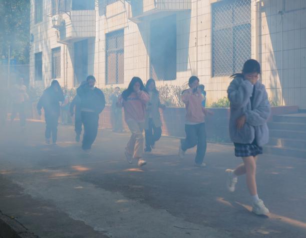 中午12時20分,消防警報拉響,模擬煙霧釋放,師生們迅速反應,捂住口鼻,彎腰低姿,沿預定路線有序撤離至操場集合點。