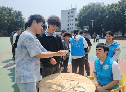 逃生演練完成后,現(xiàn)場開展多項自救演練。林麗萍副書記演示干粉滅火器“提、拔、握、壓”操作口訣,指導學生代表分組滅火;紅十字會成員模擬燒傷、摔傷場景,演示急救包扎方法;自律會成員教授固定結、連接結等繩結打法,并組織“盲人逃生”信任體驗活動,模擬濃煙環(huán)境下的協(xié)作逃生。師生們踴躍參與,現(xiàn)場氣氛熱烈。