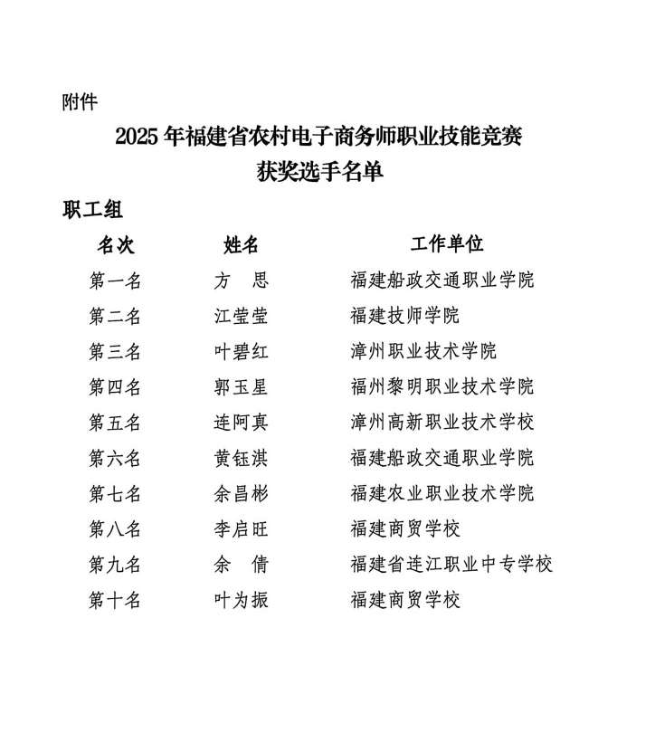由福建省商務(wù)廳、福建省人力資源和社會(huì)保障廳、福建省教育廳、福建省總工會(huì)、共青團(tuán)福建省委主辦的2025年福建省農(nóng)村電子商務(wù)師職業(yè)技能競賽獲獎(jiǎng)名單正式公布。我院師生表現(xiàn)優(yōu)異,方思老師榮獲職工組第一名,黃鈺淇老師榮獲職工組第六名,學(xué)生陳維新榮獲學(xué)生組第四名,三位師生均躋身全省前十。