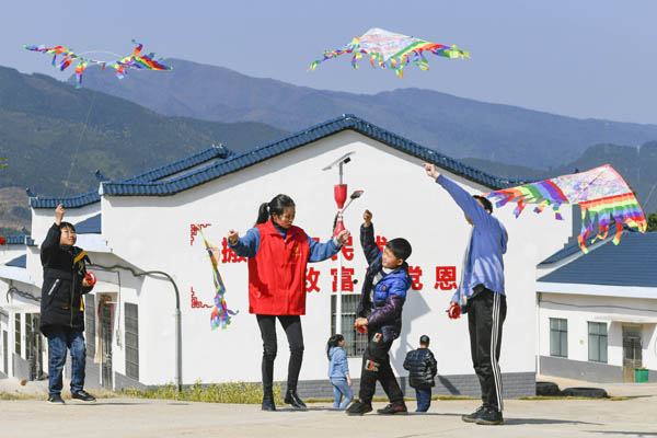 黨的十八大以來,我們黨把脫貧攻堅擺在治國理政的突出位置,組織開展了聲勢浩大的脫貧攻堅人民戰(zhàn)爭。數(shù)百萬扶貧干部傾力奉獻(xiàn)、苦干實(shí)干,同貧困群眾想在一起、過在一起、干在一起,使脫貧地區(qū)整體面貌發(fā)生歷史性巨變。圖為近日,在湖南省永州市道縣橫嶺瑤族鄉(xiāng)浪石村易地扶貧搬遷安置區(qū),孩子們開心地放風(fēng)箏。(圖片來源:視覺中國)