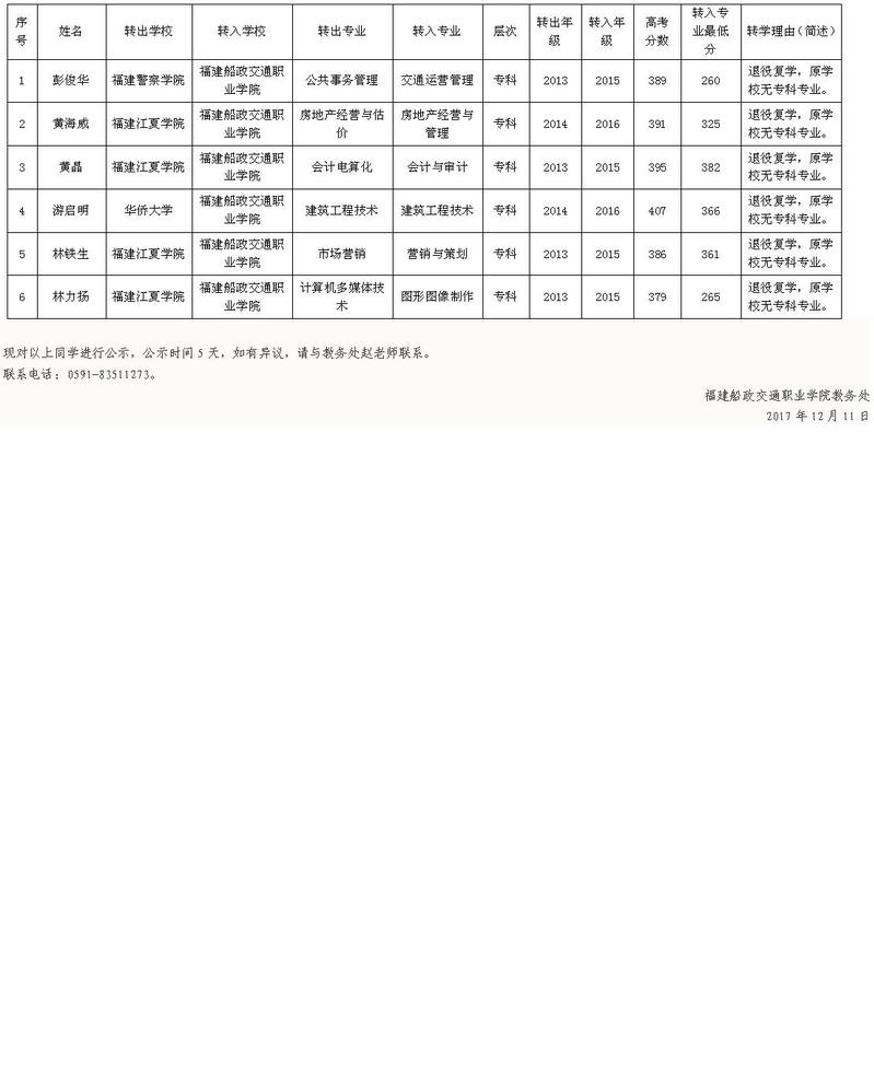 根據(jù)《福建省教育廳關(guān)于做好普通高等學校學生轉(zhuǎn)學備案工作的通知》(閩教學〔2017〕46號)文件的相關(guān)規(guī)定,經(jīng)學生本人申請、教務處審核并經(jīng)學校集體會議研究決定,同意彭俊華等六位同學轉(zhuǎn)學申請。轉(zhuǎn)學學生具體信息如下: