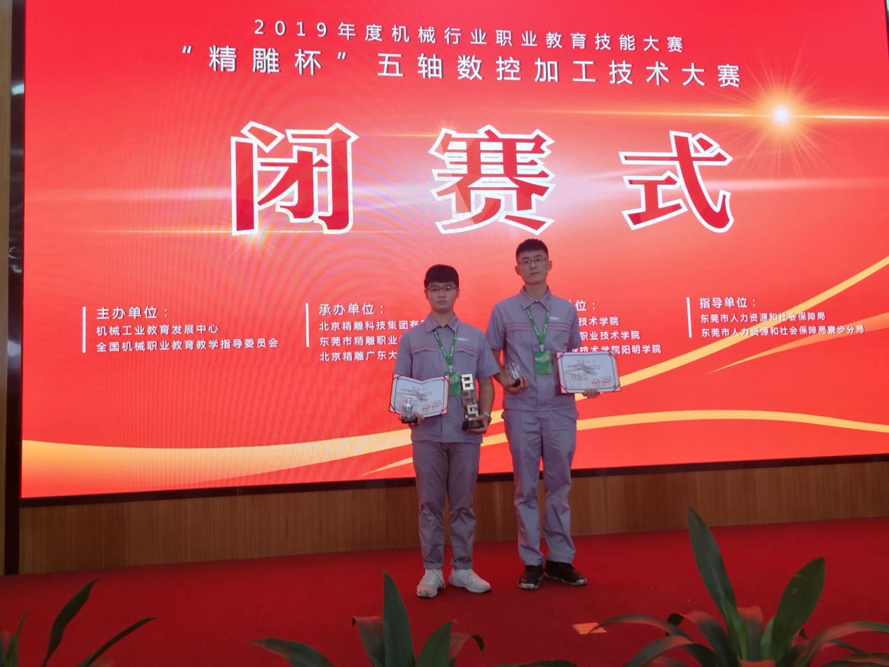 2019年度全國(guó)機(jī)械行業(yè)職業(yè)教育技能大賽——“精雕杯”五軸數(shù)控加工技術(shù)的比賽于10月31日至11月2日在廣東東莞舉行,我院學(xué)生吳仲川、魏再煌組成的代表隊(duì)榮獲全國(guó)第二名暨一等獎(jiǎng),指導(dǎo)教師李云妹、謝祖華被評(píng)為“優(yōu)秀指導(dǎo)教師”,吳仲川、魏再煌兩位同學(xué)憑借嫻熟的技能和優(yōu)異的表現(xiàn)直接被北京精雕科技集團(tuán)有限公司錄用,畢業(yè)后可直接前往北京辦理入職手續(xù)。