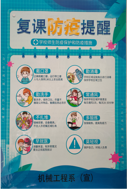 防疫無小事,我系還在宿舍和教室放置洗手液、消毒水、疫情防控知識手冊等防疫物資,為即將返校的畢業(yè)生做好防疫物資準備,實現(xiàn)及時消毒、隨時消毒。同時為每一位返校學生準備了愛心小禮包,禮包內(nèi)包含紀念徽章、口罩、礦泉水、小面包等愛心小禮品,讓學生們感受到來自學校和老師們的愛。在宿舍樓道等顯眼位置也貼上了防疫貼士、掛上條幅,表明防疫的重要性,提示畢業(yè)生們要積極防疫,在校園中也要做到不輕視、不松懈。