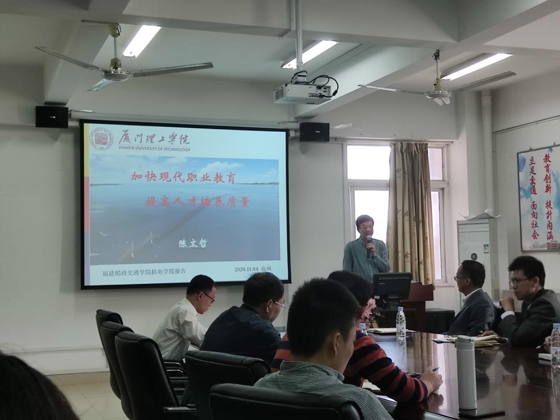 今年全國職業(yè)教育宣傳周活動的主題是“技能人才展時代風采,職教奮進慶祖國華誕”。為積極響應全國職業(yè)教育宣傳周的號召,營造濃厚的職業(yè)宣傳氛圍,提高社會各界對職業(yè)教育的認可度,進一步深化職業(yè)教育教學改革,推進現(xiàn)代職業(yè)教育,提高教學質(zhì)量,切實加強技能型人才的培養(yǎng),11月3日下午,我院邀請原廈門理工學院校長陳文哲教授作《加快現(xiàn)代職業(yè)教育 提高人才培養(yǎng)質(zhì)量》專題講座。機械學院全體教職工參會聽講,報告會由機械學院院長楊開懷博士主持。