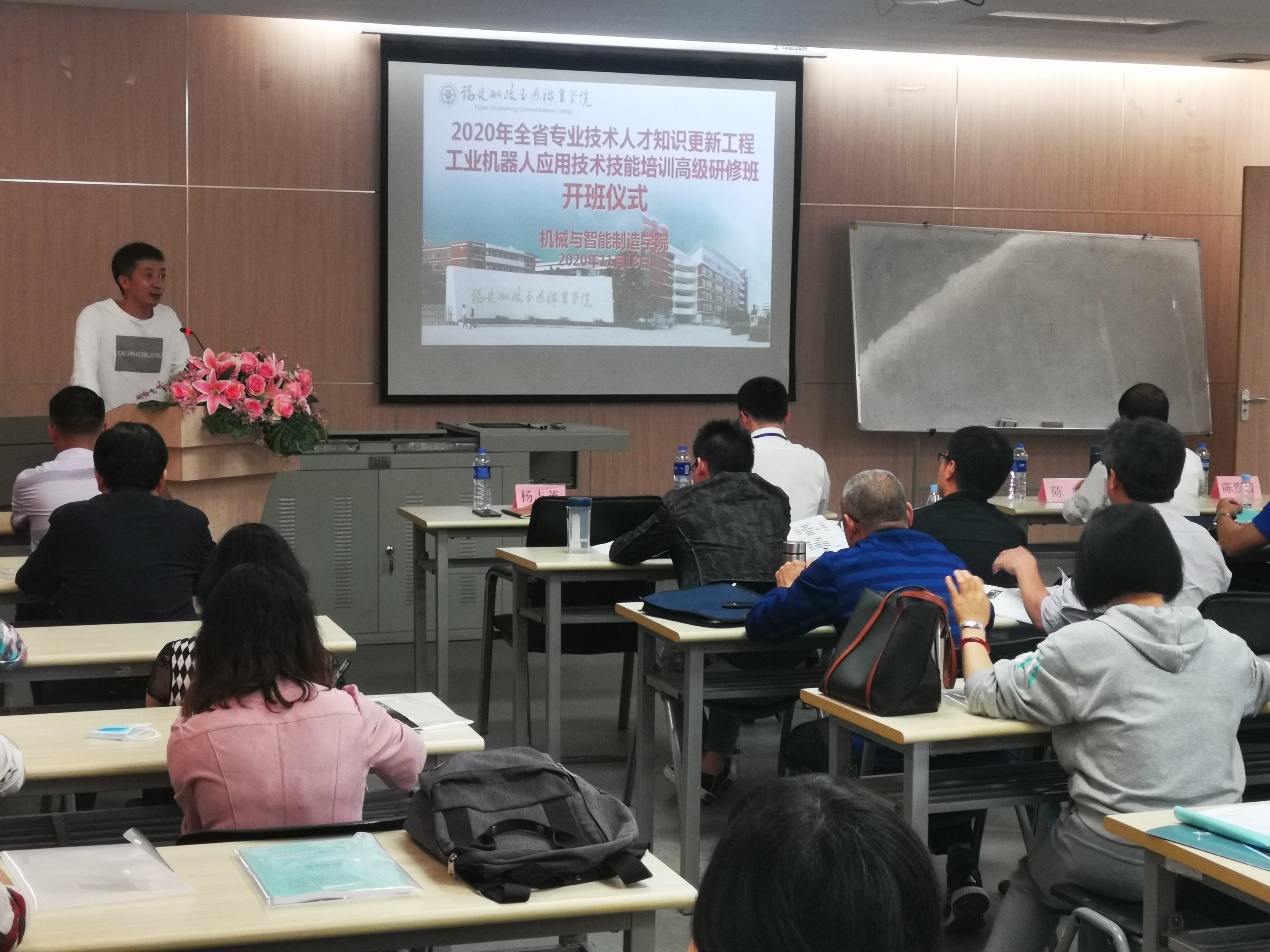 楊開懷院長首先對參加開班儀式的領(lǐng)導(dǎo)和嘉賓表示歡迎,對給予此次培訓(xùn)技術(shù)支持的福建閩大科技有限公司表示感謝。接著介紹了機(jī)械與智能制造學(xué)院工業(yè)機(jī)器人專業(yè)的歷史沿革,以及工業(yè)機(jī)器人應(yīng)用技術(shù)領(lǐng)域近年來的發(fā)展前景,我院在工業(yè)機(jī)器人專業(yè)課程優(yōu)化、實(shí)驗(yàn)室建設(shè)、技能競賽等方面取得的優(yōu)異成績,并努力致力于為我省乃至全國的工業(yè)機(jī)器人行業(yè)培養(yǎng)高素質(zhì)技能人才。