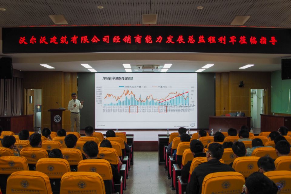 隨著我國(guó)制造業(yè)快速發(fā)展、平穩(wěn)發(fā)展并且國(guó)家對(duì)基建的日益重視,工程機(jī)械行業(yè)面臨前所未有的機(jī)遇和挑戰(zhàn)。為促進(jìn)工程機(jī)械運(yùn)用技術(shù)專業(yè)人才隊(duì)伍培養(yǎng),增加工程機(jī)械專業(yè)學(xué)生的知識(shí)面,開拓視野,全面發(fā)展。機(jī)械與智能制造學(xué)院在11月3號(hào),于1#樓學(xué)術(shù)報(bào)告廳舉辦了“工程機(jī)械行業(yè)及沃爾沃企業(yè)介紹”講座。此次講座特別邀請(qǐng)到沃爾沃建筑設(shè)備經(jīng)銷商能力發(fā)展總監(jiān)程利軍先生為我們做講解和報(bào)道。