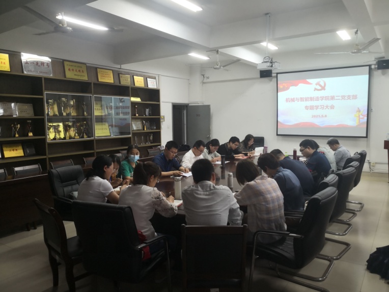 2021年5月8日機械與智能制造學院第二黨支部召開專題學習大會,組織學習《習近平在清華大學考察時強調堅持中國特色世界一流大學建設目標方向為服務國家富強民族復興人民幸福貢獻力量》、《習近平致信祝賀廈門大學建校100周年》、《中國共產黨普通高等學?;鶎咏M織工作條例》、《中國共產黨黨員教育管理工作條例》、《中國共產黨支部工作條例(試行)》等文件精神。