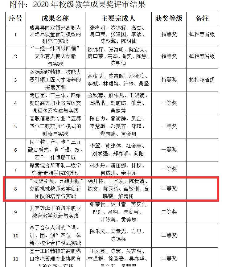 根據(jù)《福建船政交通職業(yè)學院關于開展2020年高等職業(yè)教育教學成果獎評選工作的通知》,全校共申報20項教學成果,經(jīng)專家組評審,共評出特等獎3個,一等獎4個,二等獎6個。我院《“黨建引領,五維共振”交通機械教師教學創(chuàng)新團隊的培養(yǎng)與實踐》獲校級教學成果二等獎。