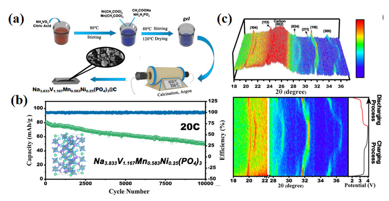 圖1 Na3.833V1.167Mn0.583Ni0.25(PO4)3/C正極的(a)制備流程圖,(b)在20C電流密度下的大電流長循環(huán)測(cè)試和(c)在初始充放電過程中進(jìn)行的原位XRD測(cè)試。