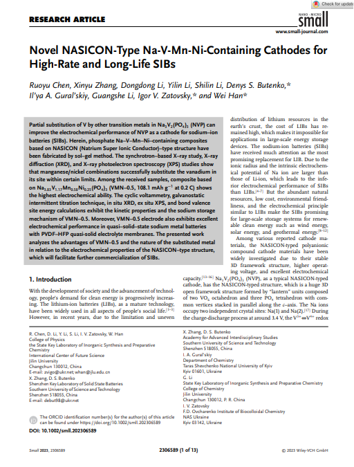 在此前的研究工作中,陳若宇老師于博士在讀期間在《Small》上發(fā)表了題為《Novel NASICON-Type Na-V-Mn-Ni-Containing Cathodes for High-Rate and Long-Life SIBs》(JCR Q1, IF=13.3)的研究論文。