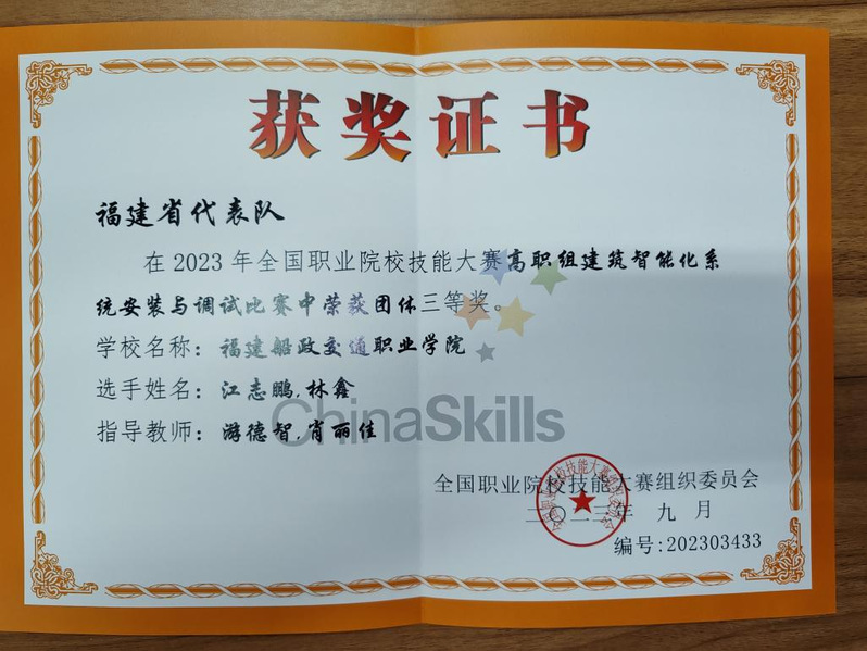 2023年9月17日--9月21日,全國職業(yè)院校技能大賽“建筑智能化系統(tǒng)安裝與調(diào)試”賽項(xiàng)在黑龍江建筑職業(yè)技術(shù)學(xué)院舉行,來自全國29個(gè)省、自治區(qū)、直轄市的65所參賽學(xué)校的300多名參賽選手參賽。經(jīng)過緊張激烈的比賽,我院游德智、肖麗佳兩位老師指導(dǎo)的江志鵬、林鑫同學(xué)獲得學(xué)生賽團(tuán)體三等獎(jiǎng)。