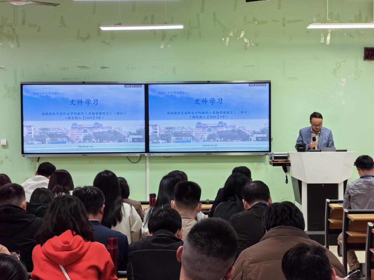 為保障學(xué)校各方面工作的正常運(yùn)轉(zhuǎn),建立正常有序的教學(xué)秩序,促進(jìn)學(xué)校教育教學(xué)工作的持續(xù)發(fā)展,進(jìn)一步完善對(duì)教師實(shí)施教學(xué)常規(guī)情況的檢查與管理,使全體教師自覺(jué)按學(xué)校管理目標(biāo)規(guī)范自己的教育教學(xué)行為,提高教師工作的積極性、主動(dòng)性,4月10日機(jī)械與智能制造學(xué)院教職工例會(huì)專(zhuān)題學(xué)習(xí)了《福建船政交通職業(yè)學(xué)院教職工考勤管理規(guī)定》(修訂)》(閩交院人【2024】4號(hào))。