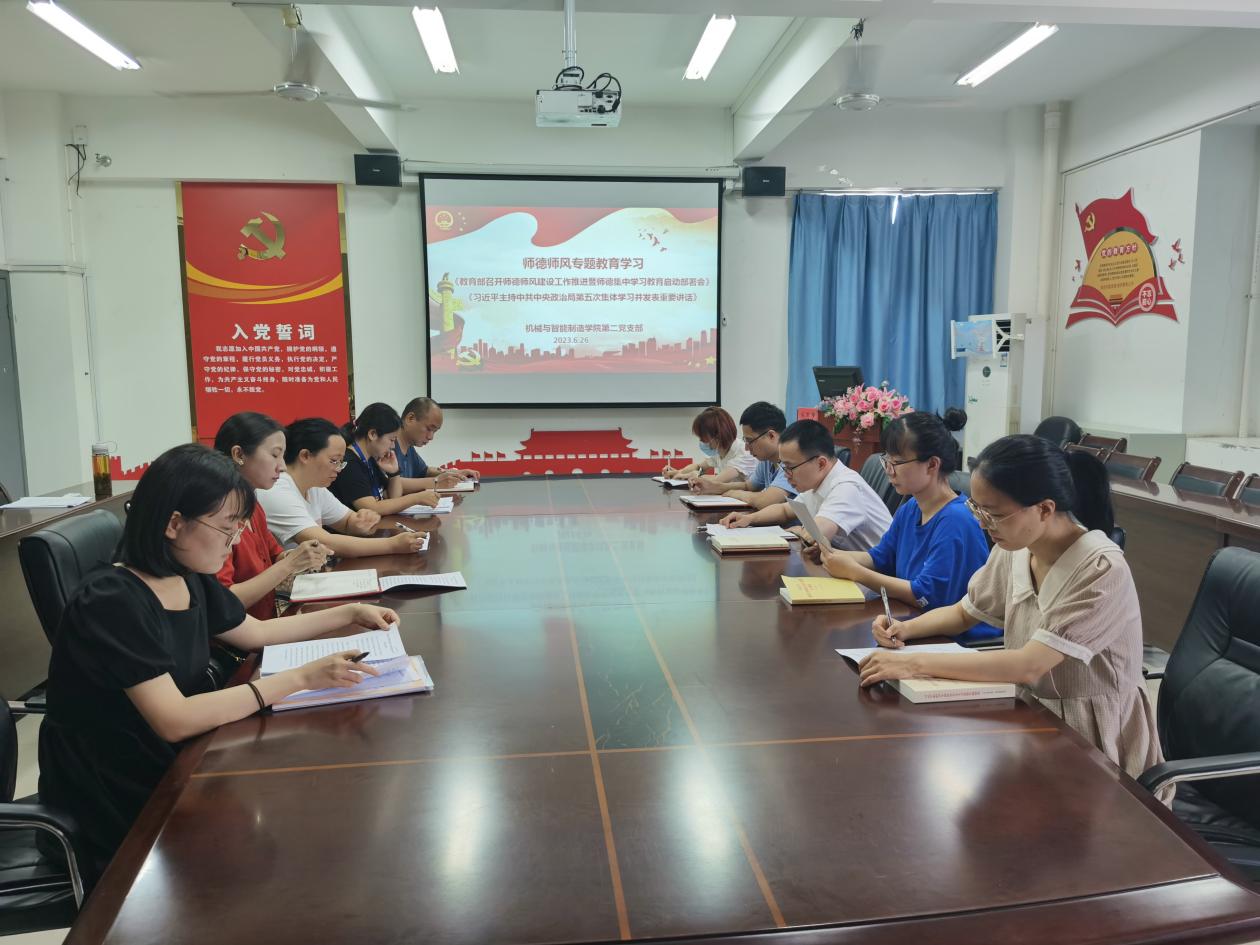 2023年6月26日,機械與智能制造學院第二黨支部開展師德師風學習教育活動,組織學習《教育部召開師德師風建設(shè)工作推進暨師德集中學習教育啟動部署會》和《習近平主持中共中央政治局第五次集體學習并發(fā)表重要講話》精神。