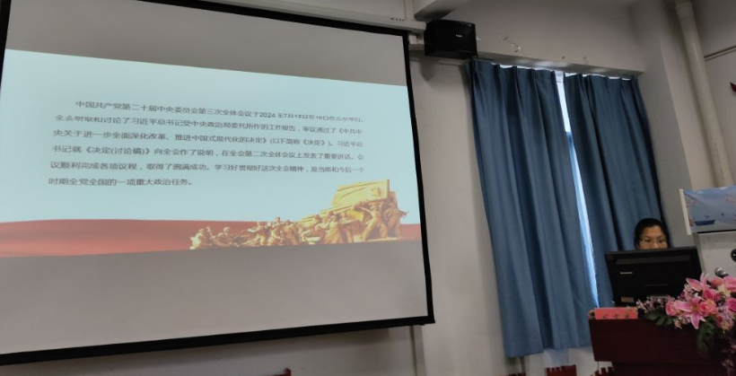 林娟穎老師對黨的二十屆三中全會的重要意義進(jìn)行了深入闡釋,并全面宣講了習(xí)近平總書記在全會上的重要講話精神。她詳細(xì)解讀了全面深化改革的重大舉措,并強(qiáng)調(diào)了全會精神貫徹落實(shí)的重要性。會議強(qiáng)調(diào),學(xué)習(xí)宣傳貫徹黨的二十屆三中全會精神是當(dāng)前和未來一段時間內(nèi)的重大政治任務(wù),必須引導(dǎo)黨員和青年將思想和行動統(tǒng)一到全會精神上,將智慧和力量集中到實(shí)現(xiàn)全會確定的目標(biāo)任務(wù)上。