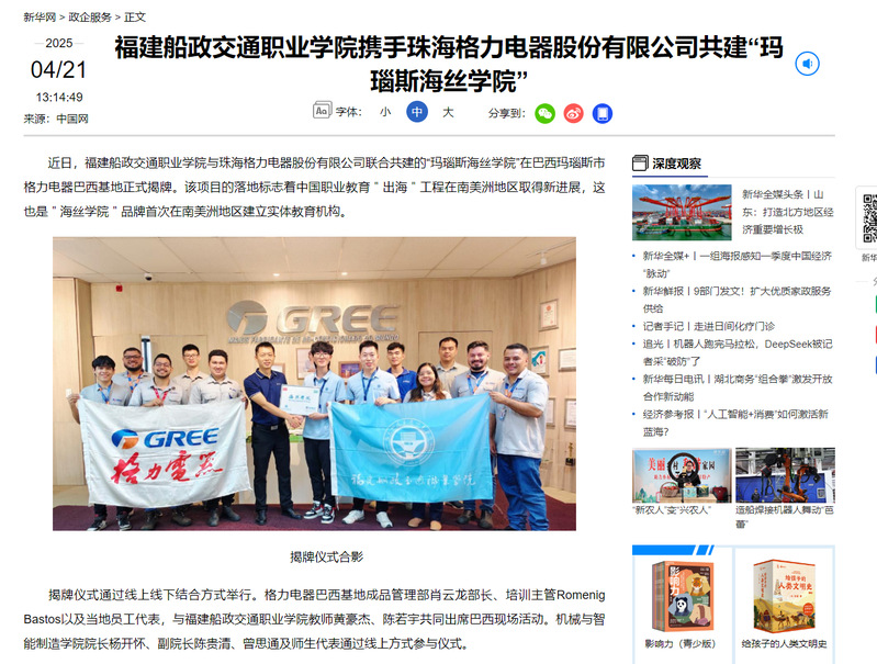 近日,福建船政交通職業(yè)學(xué)院與珠海格力電器股份有限公司聯(lián)合共建的“瑪瑙斯海絲學(xué)院”在巴西瑪瑙斯市格力電器巴西基地正式揭牌。該項(xiàng)目的落地標(biāo)志著中國職業(yè)教育"出海"工程在南美洲地區(qū)取得新進(jìn)展,這也是"海絲學(xué)院"品牌首次在南美洲地區(qū)建立實(shí)體教育機(jī)構(gòu)。