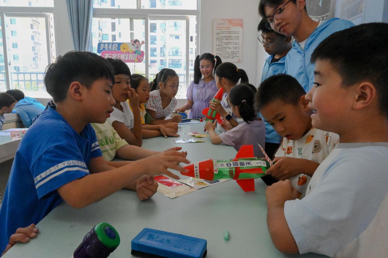 (實(shí)踐團(tuán)成員帶領(lǐng)小朋友們制作火箭發(fā)射器)