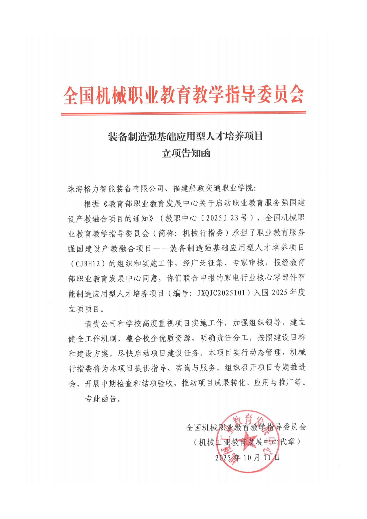 近日,全國(guó)機(jī)械職業(yè)教育教學(xué)指導(dǎo)委員會(huì)發(fā)布通知,我院聯(lián)合珠海格力智能裝備有限公司共同申報(bào)的“家電行業(yè)核心零部件智能制造應(yīng)用型人才培養(yǎng)項(xiàng)目”入選職業(yè)教育服務(wù)強(qiáng)國(guó)建設(shè)產(chǎn)教融合項(xiàng)目--裝備制造強(qiáng)基礎(chǔ)應(yīng)用型人才培養(yǎng)項(xiàng)目。