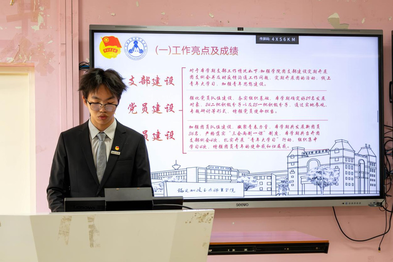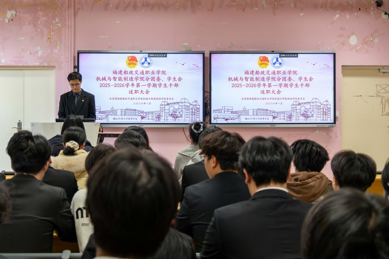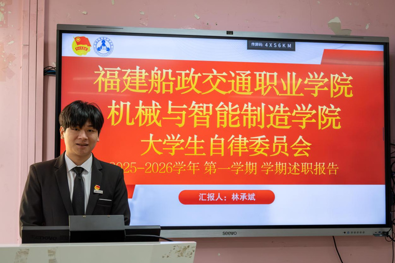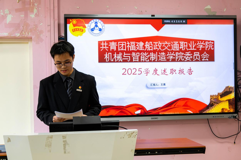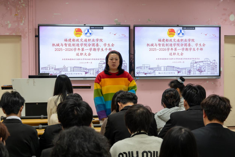2026年1月7日,共青團(tuán)福建船政交通職業(yè)學(xué)院機(jī)械與智能制造學(xué)院委員會兩委學(xué)生干部述職總結(jié)大會在福道園2號樓1-3教室順利召開,本次會議旨在全面總結(jié)2025-2026學(xué)年第一學(xué)期學(xué)生工作成效、查擺問題不足,科學(xué)謀劃新學(xué)期工作計劃,進(jìn)一步提升學(xué)生工作的凝聚力與執(zhí)行力,不斷強(qiáng)化學(xué)生干部隊伍的責(zé)任擔(dān)當(dāng)與服務(wù)意識,切實提升服務(wù)同學(xué)成長成才的能力水平。學(xué)院黨總支書記朱寶杉、院分團(tuán)委書記鄭茜、院分團(tuán)委副書記華銀、院分團(tuán)委組織委員楊榕、院分團(tuán)委宣傳委員官蕾及輔導(dǎo)員林婷出席會議,會議由院分團(tuán)委兼職副書記(學(xué)生)王晨主持。