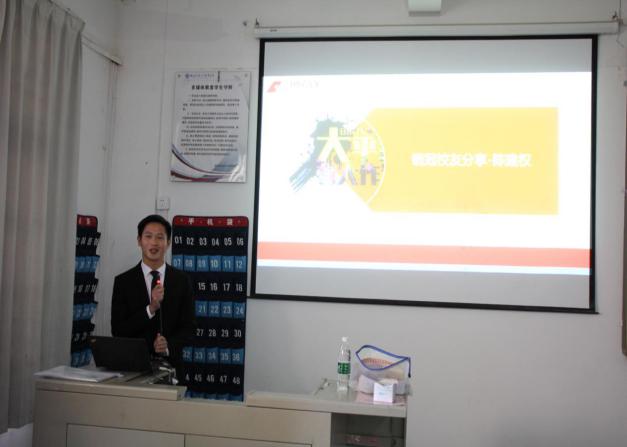 第三場企業(yè)家進(jìn)校園講座: 2018年11月17日于北區(qū)22號樓203教室,由2016屆汽車技術(shù)服務(wù)與營銷專業(yè)優(yōu)秀校友、福建創(chuàng)宏新能源汽車銷售服務(wù)有限公司展廳經(jīng)理姜洪飛進(jìn)行分享,他講座的主題是:“時(shí)間 — 地點(diǎn) — 過程”。 他告誡學(xué)生在大學(xué)期間要夯實(shí)專業(yè)知識基礎(chǔ),敢于挑戰(zhàn)、敢于創(chuàng)新,肯于付出,準(zhǔn)備好職前助力點(diǎn),為以后經(jīng)營職業(yè)起點(diǎn)、把握轉(zhuǎn)折點(diǎn)、贏得發(fā)展點(diǎn)奠定良好的基礎(chǔ)。
