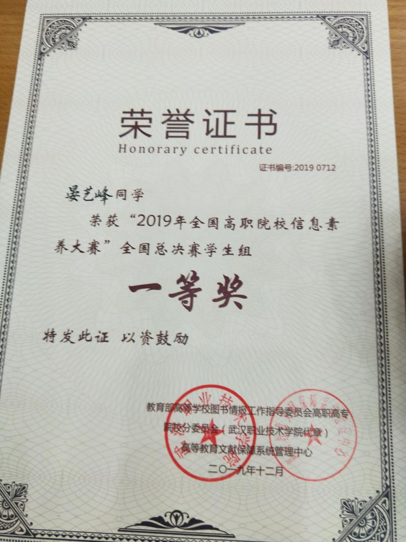 2019年12月3日-5日,我系晏藝峰同學(xué)參加在深圳舉辦的首屆全國高職院校信息素養(yǎng)大賽全國總決賽,憑借扎實(shí)的理論知識、過硬的訓(xùn)練功底以及良好的心理素質(zhì),不懼強(qiáng)手、沉著應(yīng)對,在100位選手中脫穎而出,斬獲總決賽學(xué)生組一等獎(jiǎng),盡顯汽車運(yùn)用工程系學(xué)子的自信與風(fēng)采。