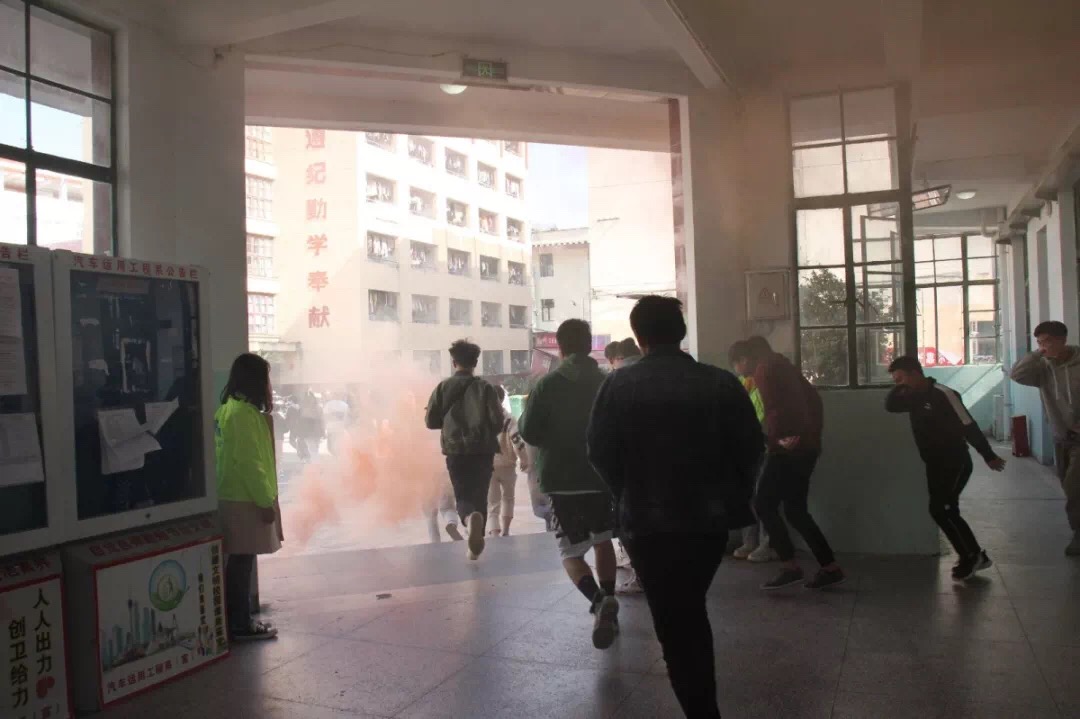 本次活動,系部制定了詳細(xì)的演練活動方案,對各崗位的分工職責(zé)作出了明確部署,劃定了各班級的逃生疏散路線,配備了煙霧模擬器,以接近真實(shí)效果、還原逼真場景。本次演練活動,是模擬因教室電腦故障產(chǎn)生火花,從而引發(fā)火災(zāi)。中午12點(diǎn)整應(yīng)急疏散演練正式開始,濃煙滾滾,警報(bào)長鳴,工作人員向同學(xué)們廣播:“撤離廣播,撤離廣播,汽車系教室發(fā)生火災(zāi),全體學(xué)生聽到廣播以后緊急疏散,注意不要慌亂,聽從指揮,有序撤離?!毕嚓P(guān)老師聽到廣播立即到達(dá)指定崗位,指導(dǎo)學(xué)生快速按照指定路線撤離疏散。在各層疏散引導(dǎo)人員的指揮下,全體學(xué)生整齊有序地到達(dá)指定場地,按班級進(jìn)行集中點(diǎn)名,各班將點(diǎn)名結(jié)果匯報(bào)輔導(dǎo)員。