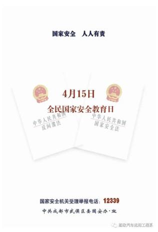 18汽營(yíng)一班 張曉玲 汽車系學(xué)生會(huì)主席團(tuán)成員:“國安才能國治,治國必先治安"。4月15日,是國家安全教育日,更準(zhǔn)確的說法是全民國家安全教育日,今年的4月15日是首個(gè)全民國家安全教育日。今天學(xué)校組織我們觀看全民國家安全教育日的直播,其實(shí)很多的危險(xiǎn)都潛藏在我們的身邊,我們應(yīng)該小心謹(jǐn)慎面對(duì)。國泰民安是人民群眾最基本最普遍的愿望,我們不僅僅要在這一天學(xué)習(xí)國家安全知識(shí),而應(yīng)該融入現(xiàn)實(shí)的每一天里,好好保護(hù)我們的祖國。