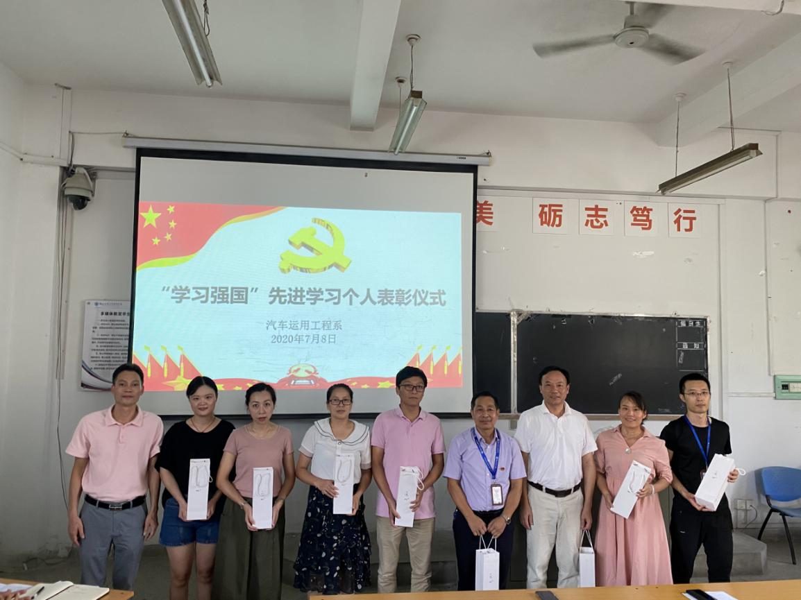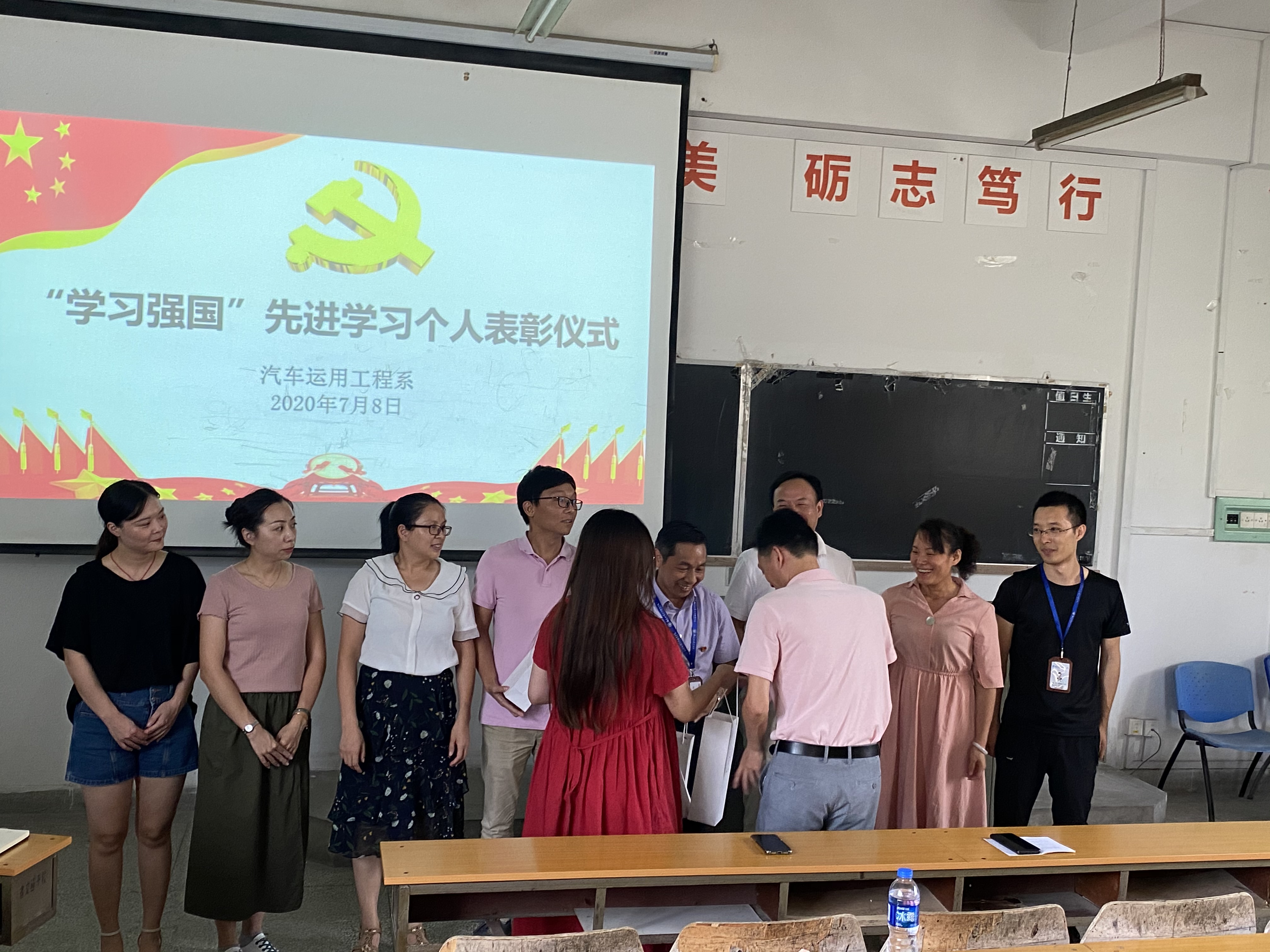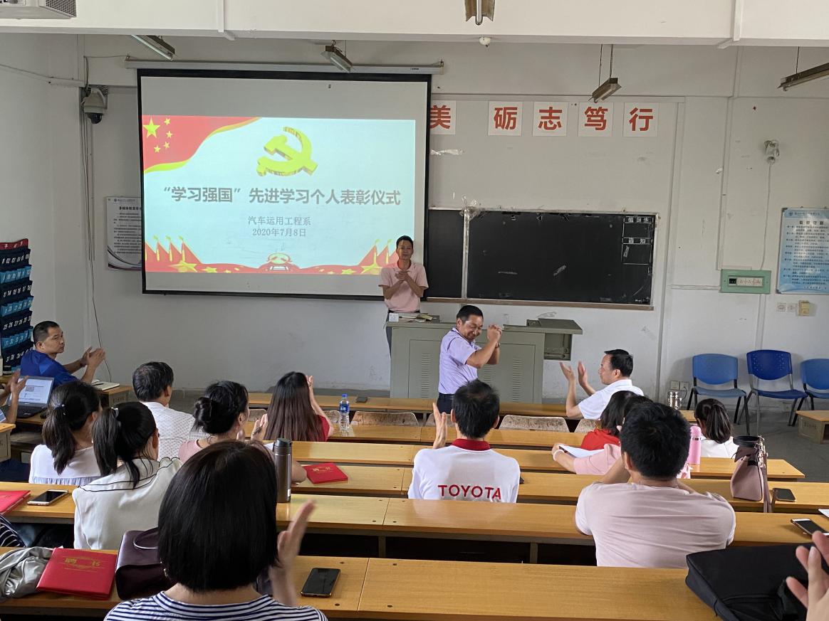 2020年7月8日汽車系黨總支在第二階梯教室召開(kāi)全系教職工大會(huì),對(duì)謝哲偉等8名同志學(xué)習(xí)強(qiáng)國(guó)“學(xué)習(xí)先進(jìn)個(gè)人”進(jìn)行表彰。
