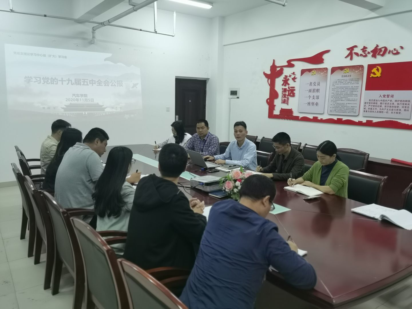 11月5日上午,汽車學院黨總支理論學習中心組在圖書館九樓會議室召開學習會,傳達學習黨的十九屆五中全會精神。學院理論學習中心組成員、各黨支部書記、全體輔導員參加會議。會議由黨總支書記蔡華錦主持。