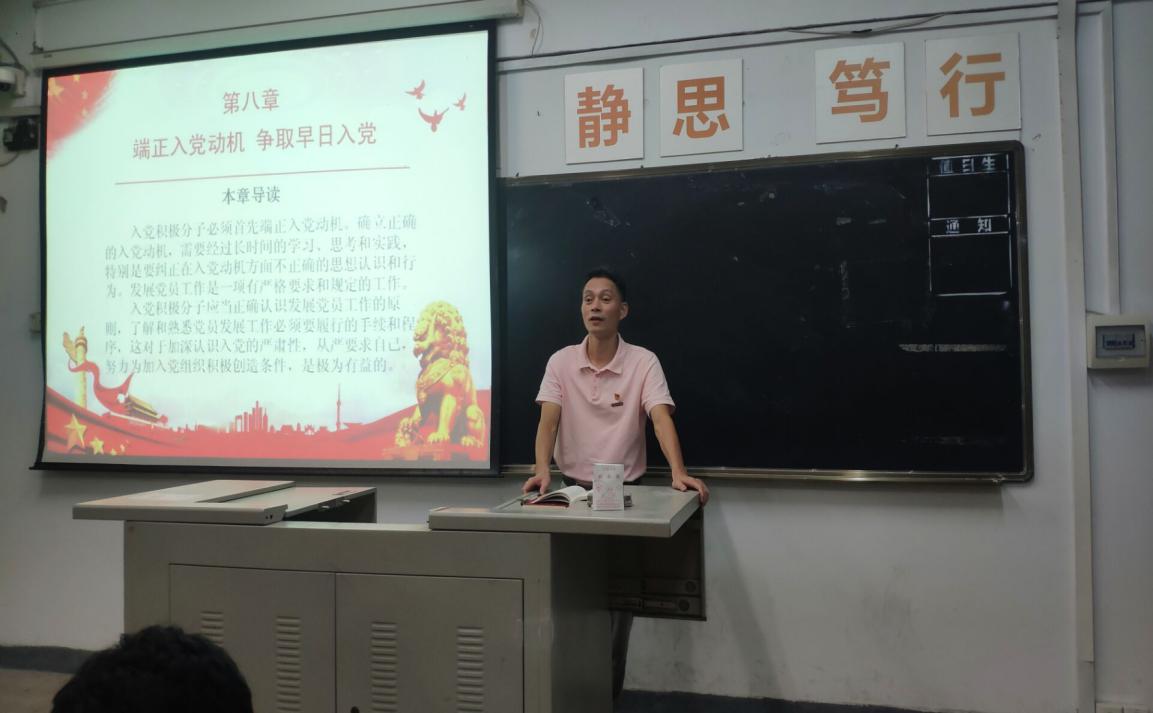 開班儀式后蔡華錦書記為學(xué)員上《明確中國共產(chǎn)黨黨員的條件和義務(wù)、權(quán)利》、《端正入黨動(dòng)機(jī),爭取早日入黨》的黨課。作為申請(qǐng)入黨和已經(jīng)入黨的人都必須了解中國共產(chǎn)黨黨員的條件,加入黨組織的成員既要履行一定的義務(wù),同時(shí)也享有黨章所規(guī)定的一定的權(quán)利。忠實(shí)履行黨員義務(wù)和積極行使黨員權(quán)利是黨員先進(jìn)性的集中體現(xiàn),說明了黨員義務(wù)與權(quán)利兩者間辯證統(tǒng)一、相輔相成的關(guān)系。確立正確的入黨動(dòng)機(jī),需要經(jīng)過長時(shí)間的學(xué)習(xí)、思考和實(shí)踐,特別是要糾正在入黨動(dòng)機(jī)方面不正確的思想認(rèn)識(shí)和行為,同學(xué)們要樹立正確的入黨動(dòng)機(jī),加強(qiáng)思想修養(yǎng),提高政治素質(zhì),嚴(yán)于律己,樹立為人民服務(wù)的理念,從小事做起,堅(jiān)定理想信念,發(fā)揮黨員的先鋒模范作用。在場的同學(xué)們認(rèn)真聆聽,牢牢記住了蔡華錦書記講授的內(nèi)容和寄予的期望。