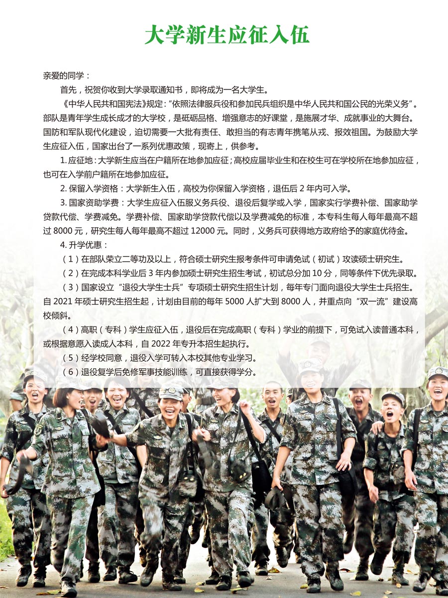 4、應(yīng)征入伍同學(xué)提供入伍證復(fù)印件辦理保留學(xué)籍手續(xù),退役復(fù)學(xué)同學(xué)提供退役證復(fù)印件辦理復(fù)學(xué)手續(xù)。